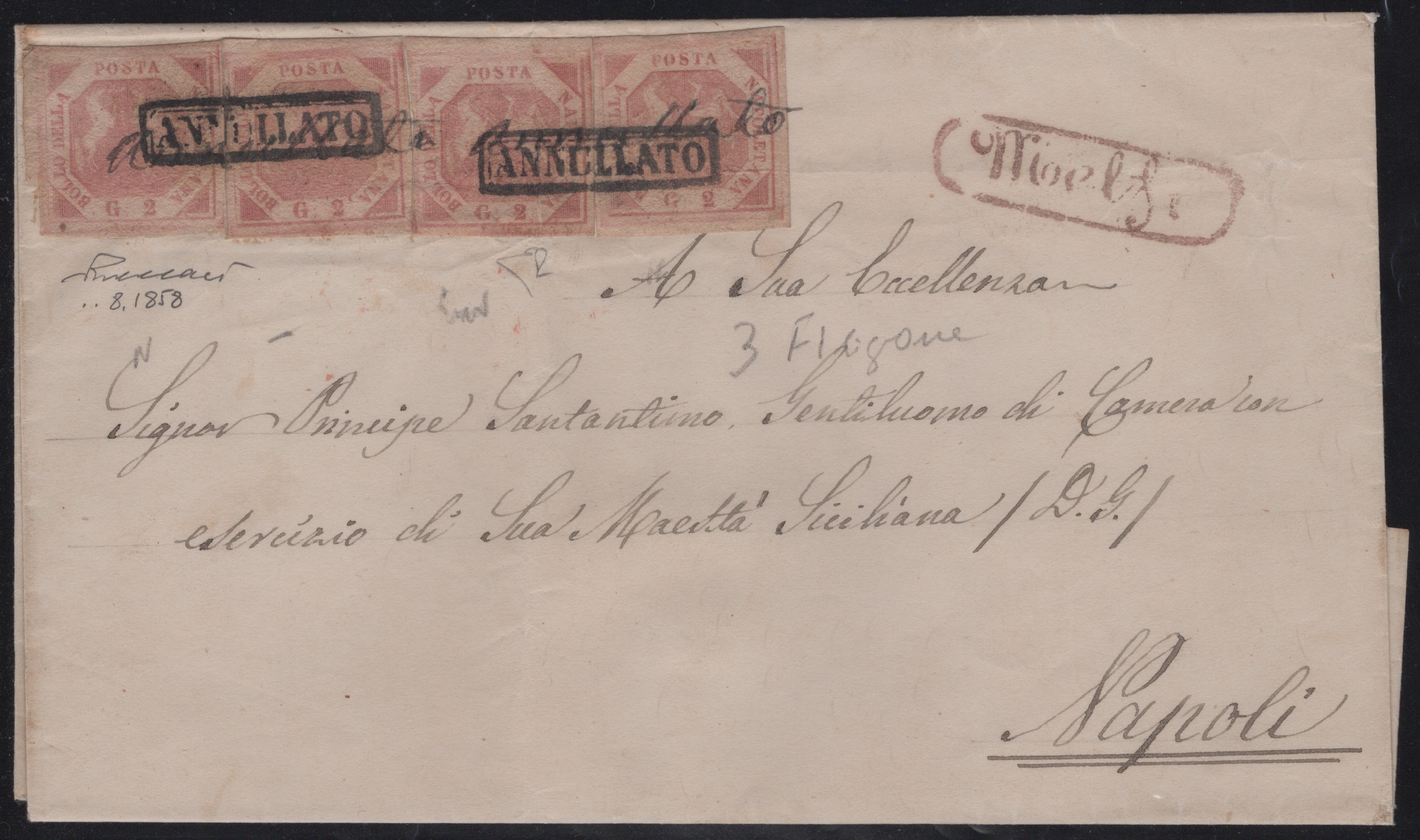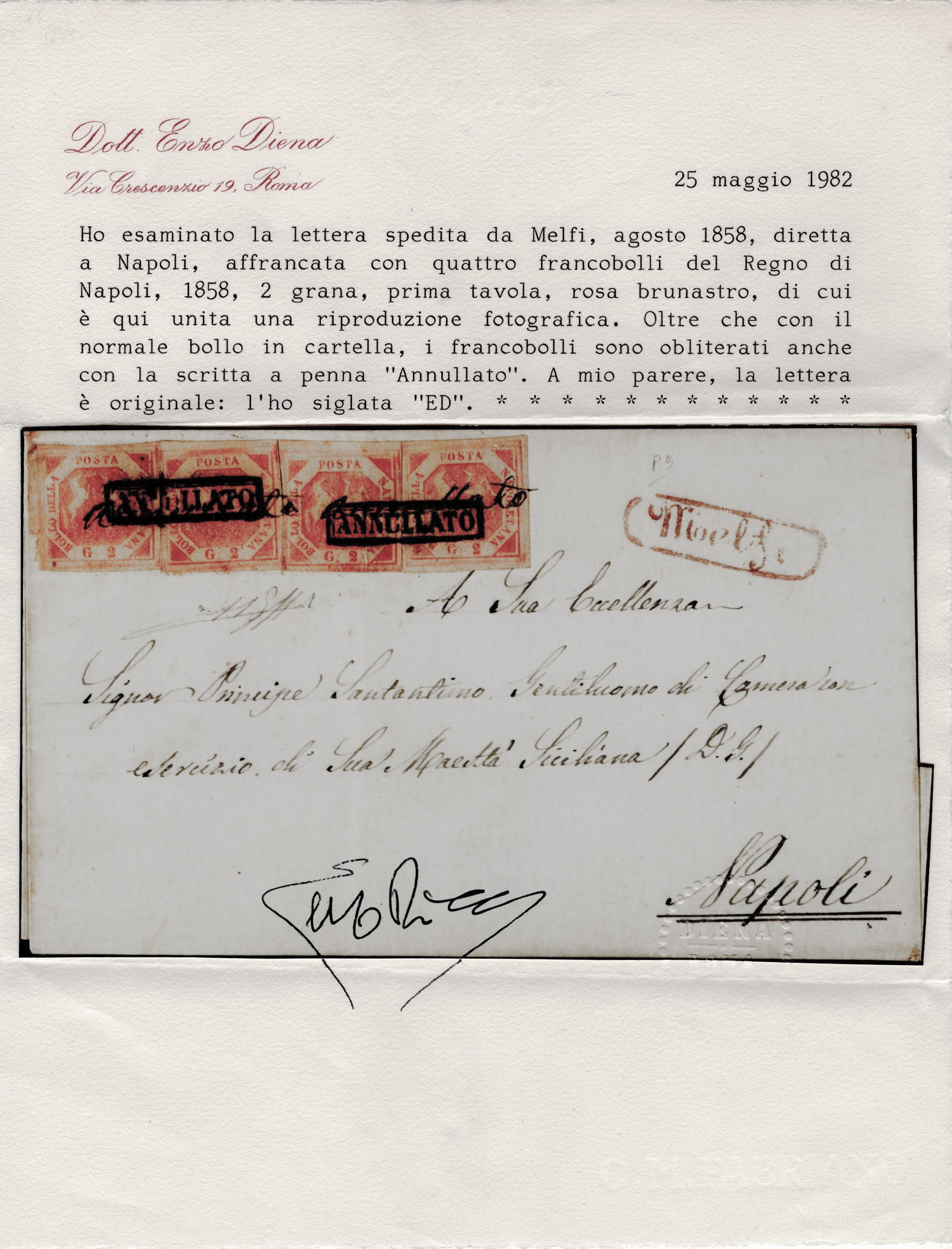 1858 - Lettera da Melfi per Napoli affrancata per 8gr. tramite quattro valori da 2gr. I tav. rosa n.5, inizialmente, a causa di una momentanea mancanza del timbro in cartella ''annullato'' presso l'ufficio postale di Melfi, i francobolli vennero annullati a penna con la scritta ''ANNULLATO'' per poi essere nuovamente timbrati a Napoli con l'annullo in cartella (13pt.). Raro insieme, piega d'archivio. (A-) (Cert. Enzo Diena, Vaccari)