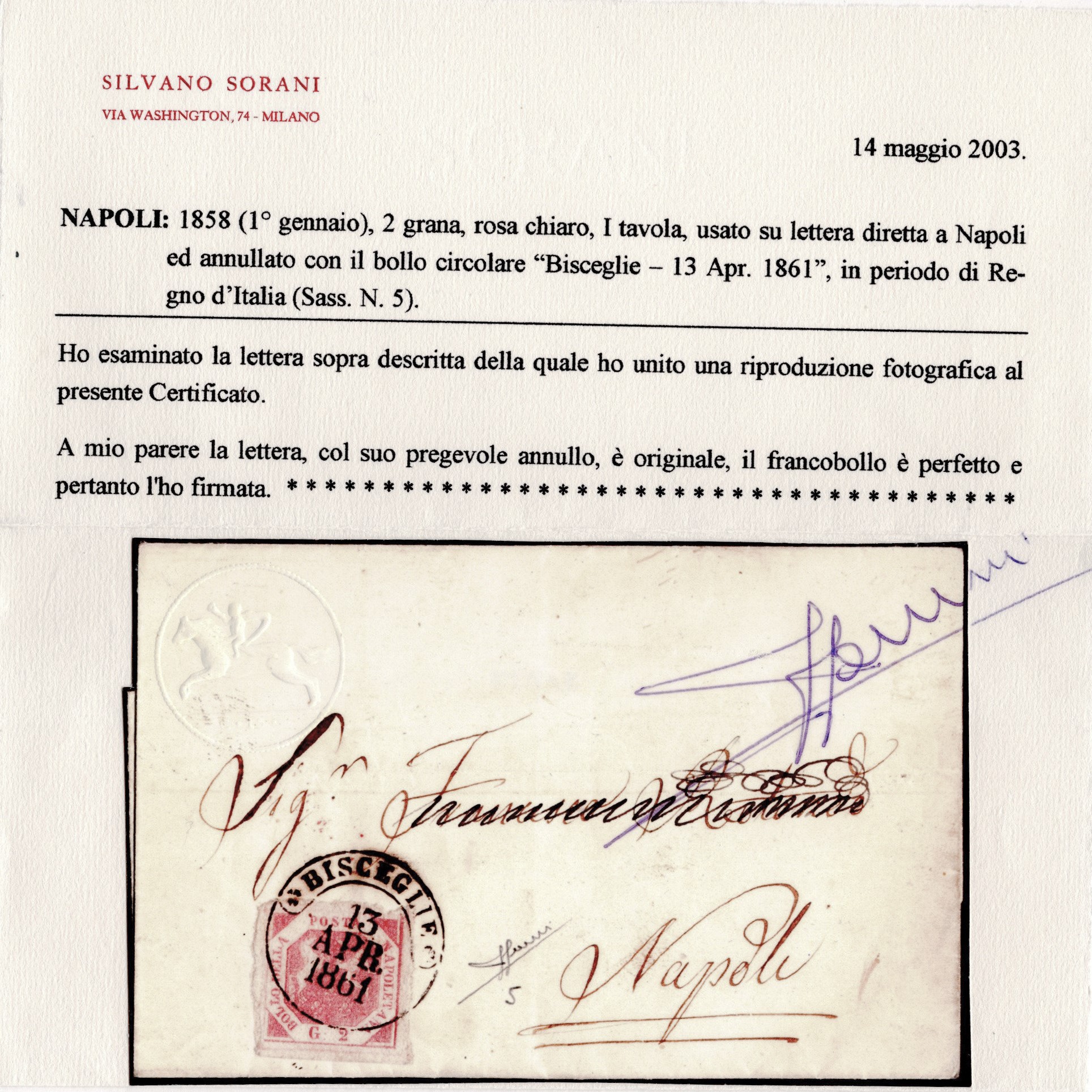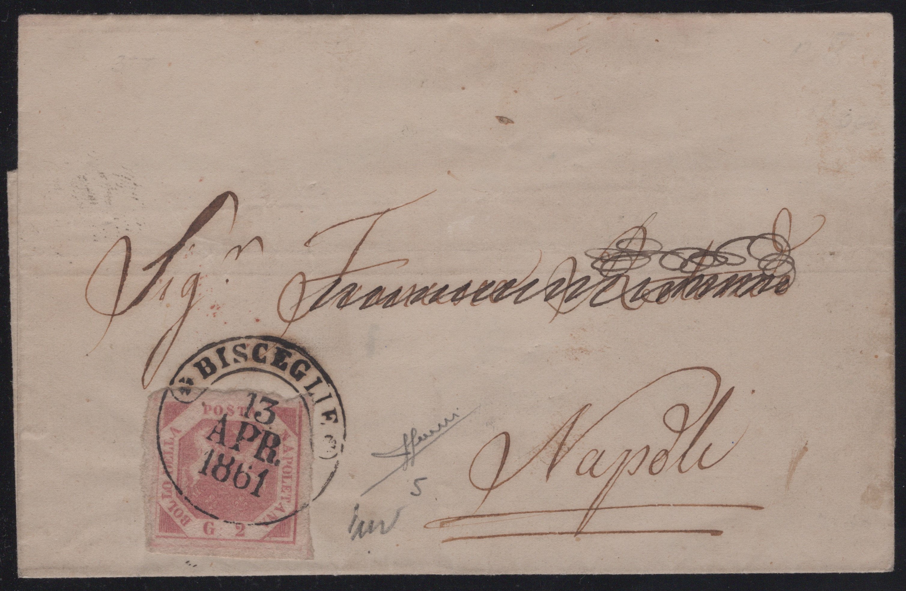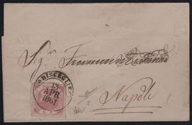 13.04.1861 - Lettera da Bisceglie per Napoli affrancata tramite un 2gr. rosa n.5, sull'affrancatura il cerchio di Bisceglie (10pt.). Insieme non comune. (LUX) (Cert. Sorani)