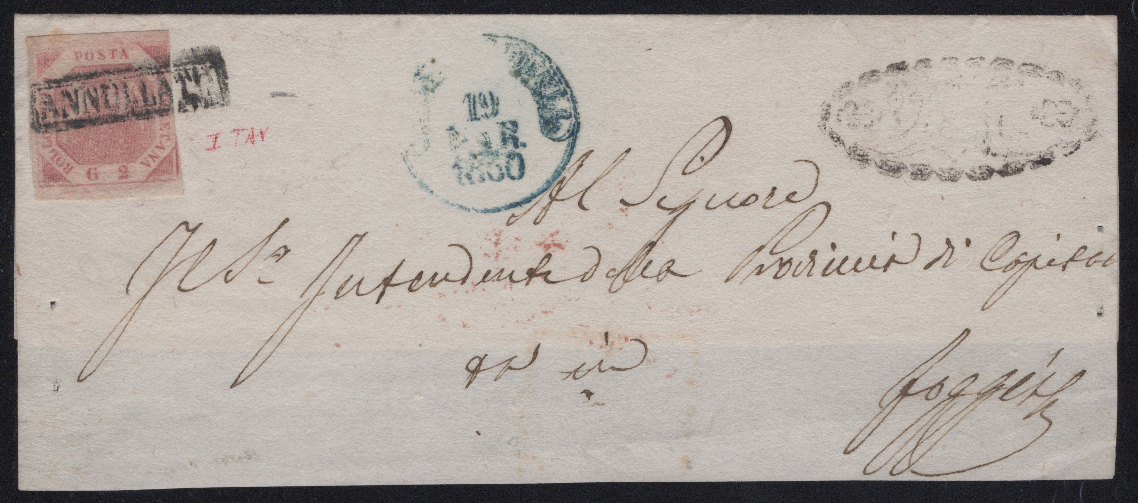 19.03.1860 - Lettera (sono presenti tutti gli annulli di transito ma al retro manca il lembo inferiore) da Viesti per Foggia affrancata tramite un 2gr. I tav. rosa chiaro n.5. Sull'affrancatura l'annullo in cartella ''Annullato'' e sulla sovrascritta il cerchio in azzurro di Manfredonia e l'ovale con fregi di Viesti (12pt.). (A-)