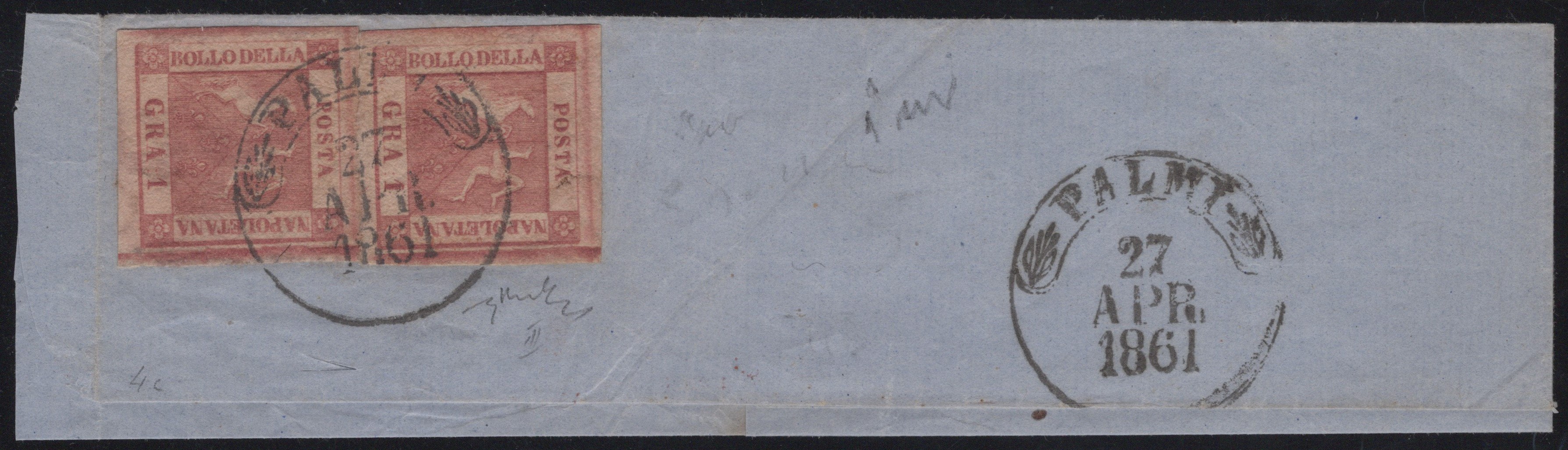 27.04.1861 - Frammento di lettera affrancata tramite due valori da 1gr. carminio scuro n.4c annullati tramite il cerchio di Palmi (10pt.) (A) (Chiavarello)