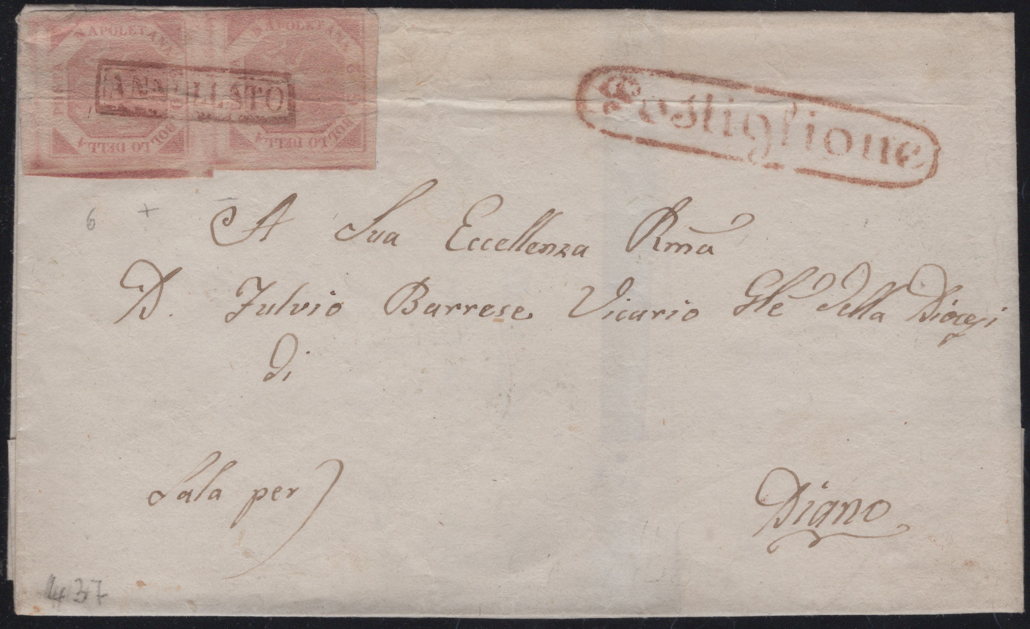 1858 - Lettera da Postiglione per Sala affrancata per 4 grana tramite una coppia del 2gr. rosa chiaro II tav. n.6, sull'affrancatura l'annullo in cartella ''Annullato'' in rosso e sulla sovrascritta l'ovale in rosso di Postiglione (12pt.). Piega d'archivio. (B)