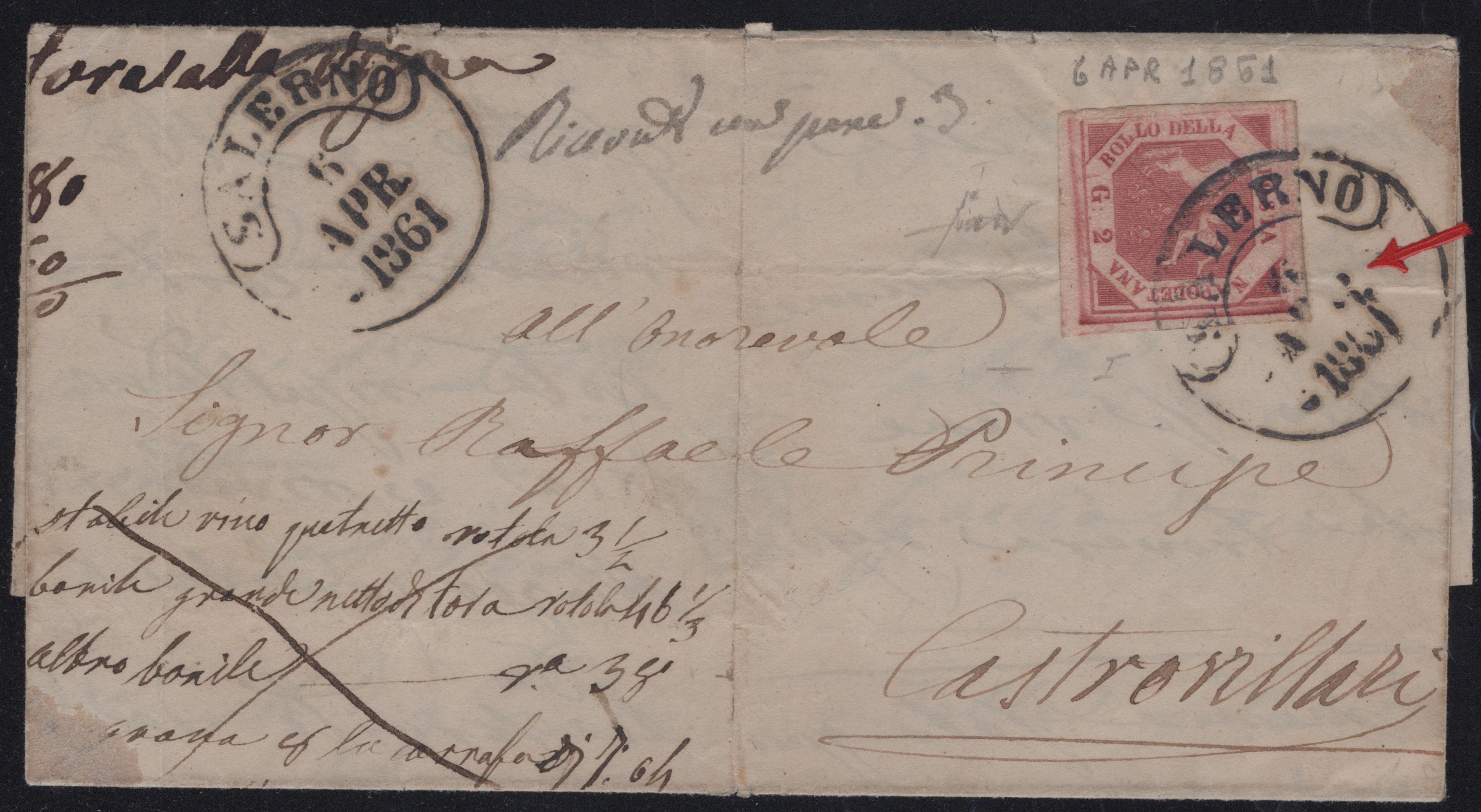 06.04.1861 - Lettera da Salerno per Castrovillari affrancata tramite un 2gr. I tav. carminio n.5e. Sull'affrancatura l'annullo a cerchio di Salerno (9pt.) Piega d'archivio. (A-)