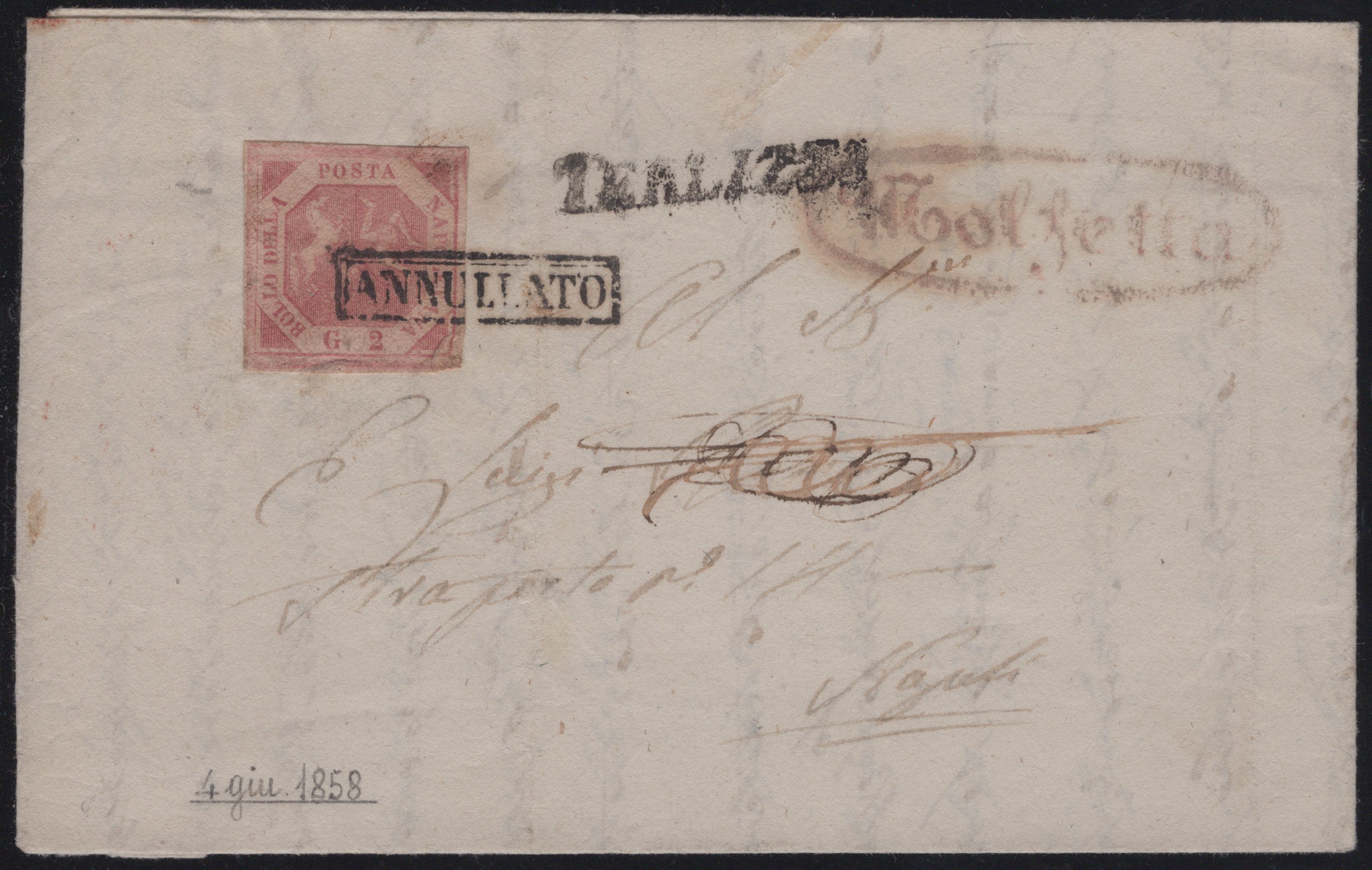 04.06.1858 - Lettera da Terlizzi per Napoli tramite un 2gr. I tav. rosa lillaceo n.5a, sull'affrancatura e sul fronte la combinazione SD di Terlizzi + Annullato in cartella e ovale in rosso di Molfetta (pt.6). Insieme non comune.