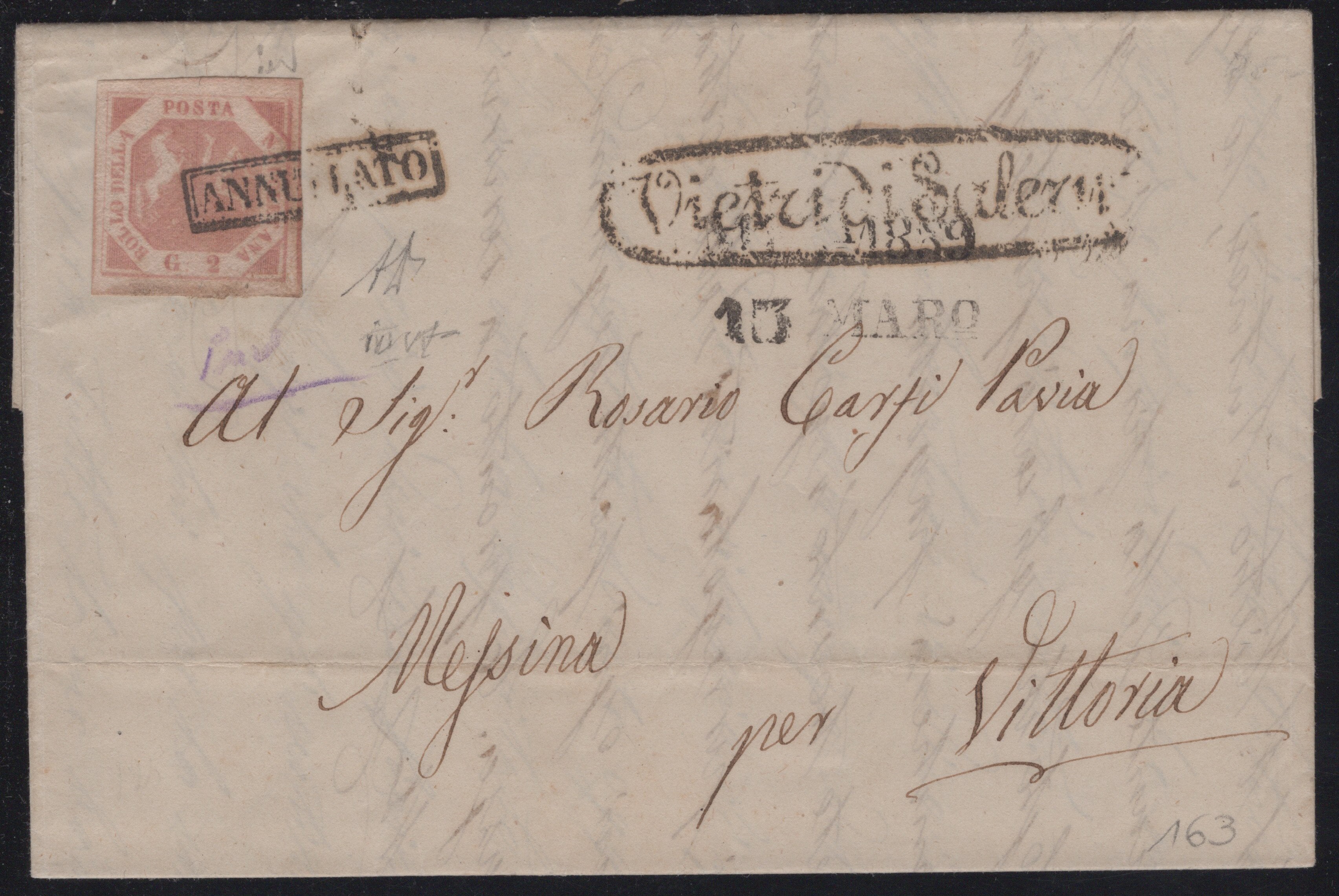 08.03.1859 - Lettera da Vietri di Salerno per Vittoria affrancata tramite un 2gr. III tav. rosa chiaro n.7b, sull'affrancatura l'annullo in cartella ''Annullato'' e sulla sovrascritta l'ovale di Vietri di Salerno (10pt.) (A+) (Alberto Diena)