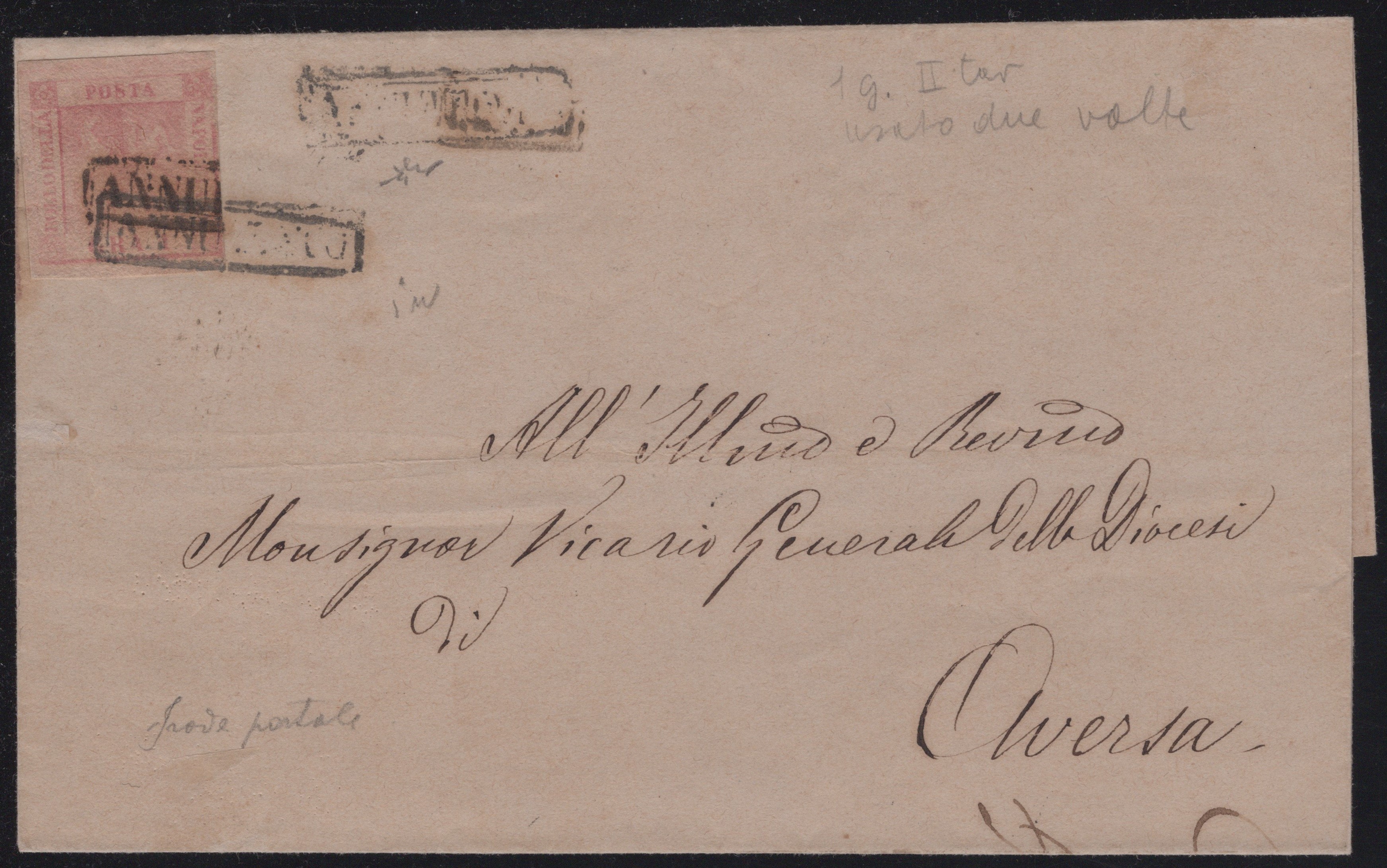 26.04.1858 - Lettera da Napoli per Aversa affrancata tramite 1gr. I tav. rosa chiaro n.3 utilizzato in frode postale perchè evidentemente già precedentemente utilizzato. Apposto sulla sovrascritta l'annullo in cartella ''Francobollo Insufficiente''. Insieme non comune. (A-) (Chiavarello)