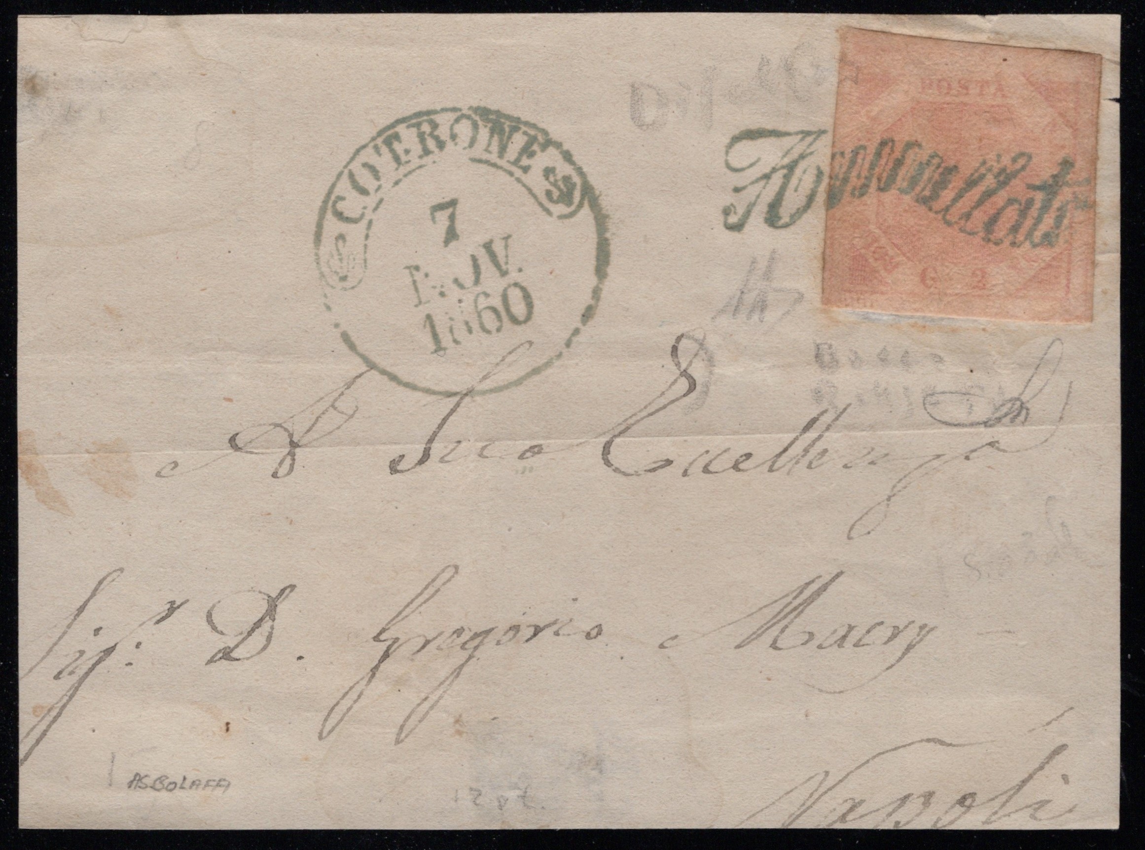 1860 - 2gr. Rosa chiaro n.7 su grande frammento di lettera annullato tramite lo svolazzo in verde di Cotrone (12pt.) raro insieme. (A) (Alberto Diena)