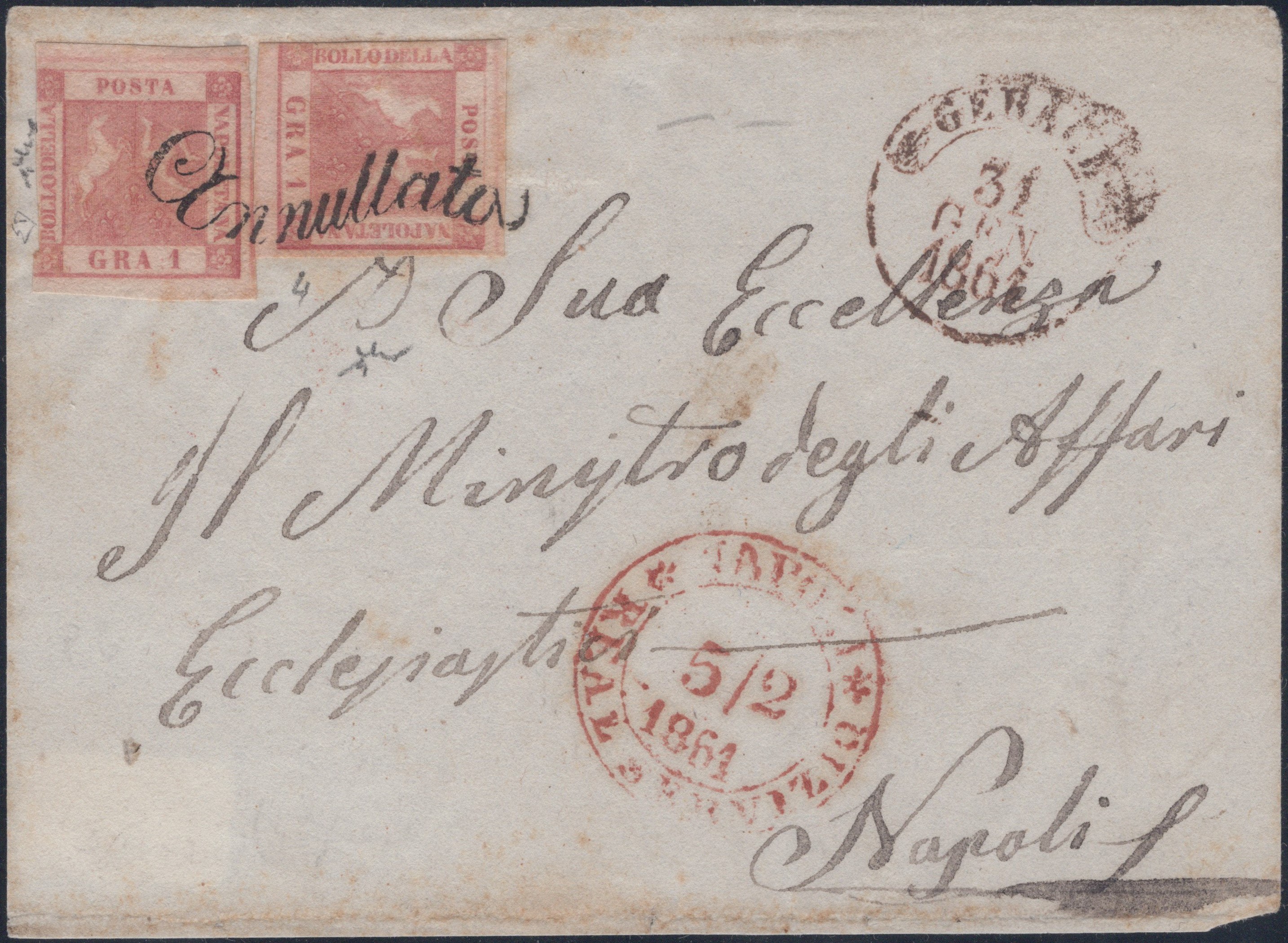 1860 - Fronte di lettera da Gerace per Napoli affrancata tramite due esemplari da 1gr. II tav. rosa carminio n.4. Sull'affrancatura lo svolazzo tipo 18 di GERACE e sulla soprascritta il Doppio cerchio ''Napoli Real Servizio'' (pt.12+1)