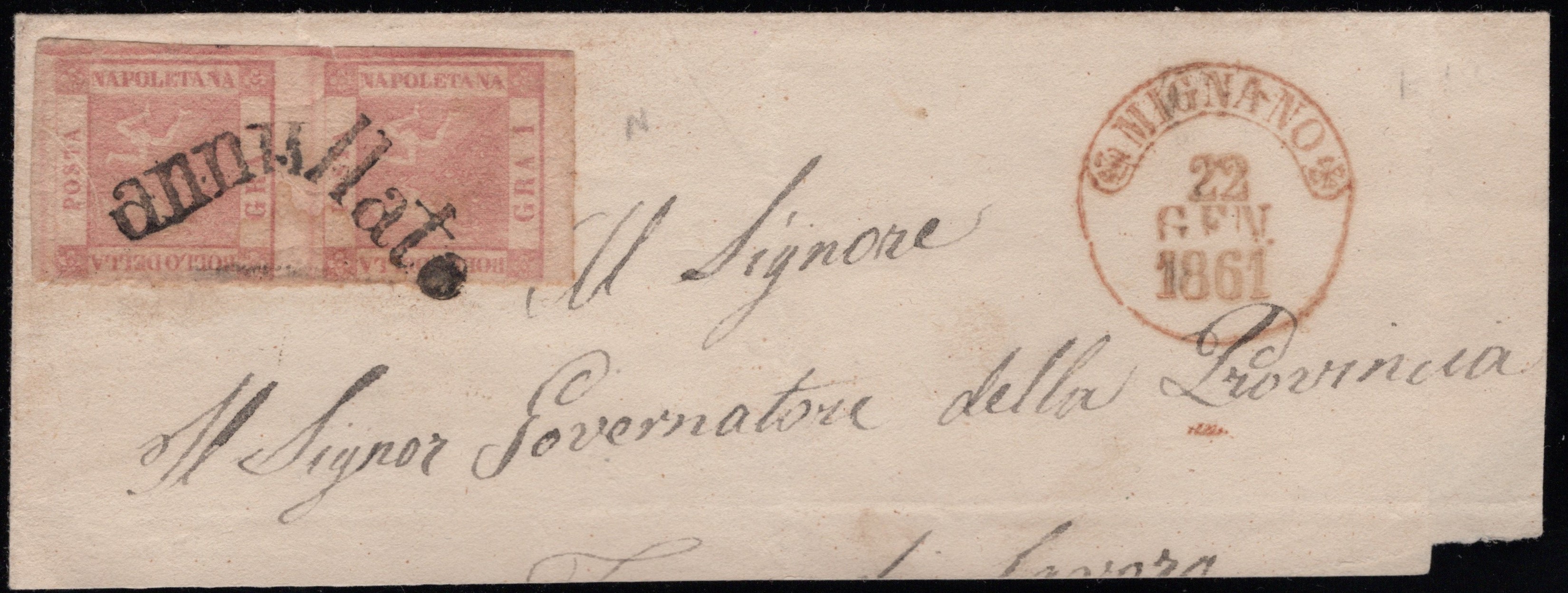 1861 - Frammento di lettera affrancata tramite una coppia del 1gr. II tav. n.4 annullata tramite lo svolazzo tipo 7 di MIGNANO (pt.R1). (A-)