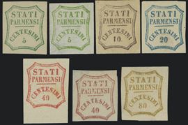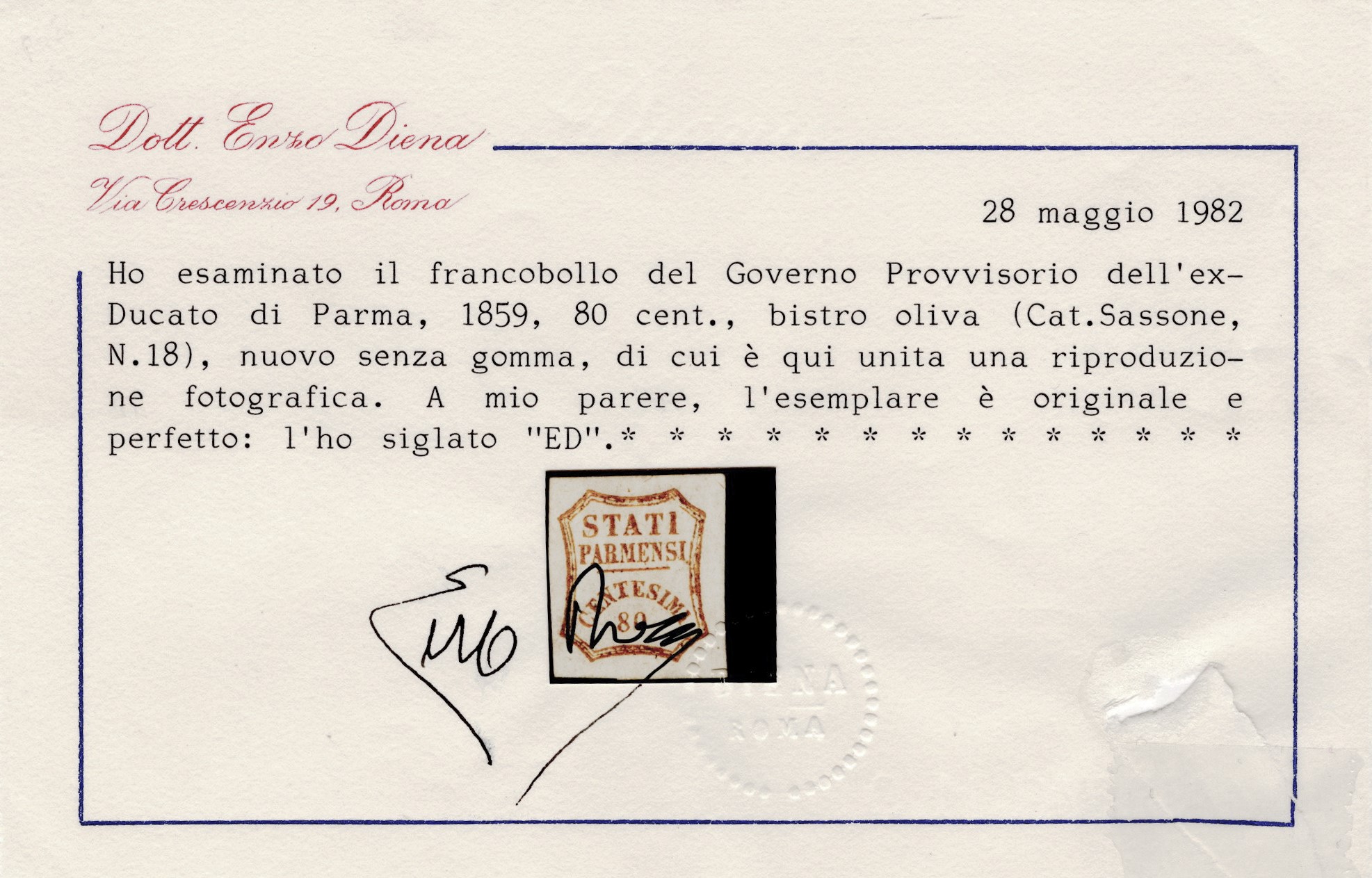 1859 - La serie completa nuova, di qualità mista. n.12 nuovo con gomma perfetto (Emilio Diena, Alberto Diena) , n.13 nuovo con gomma perfetto (Enzo Diena, Alberto Diena), n.14 nuovo con gomma perfetto (Alberto Diena), n.15 nuovo con gomma perfetto (Alberto Diena), n.16 nuovo con gomma, assottigliamento nell'angolo superiore sinistro, n.17 nuovo con gomma integra bordo di foglio in basso (Enzo Diena), n.18 nuovo senza gomma perfetto (Vaccari per esteso, Alberto Diena, Certificato Enzo Diena)