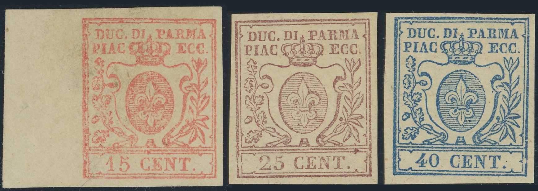1857 - Splendida serie n.9/11, nuova con gomma originale. il 15 cent. con ampio bordo di foglio a sinistra. Cat. 3.000++. (A+)