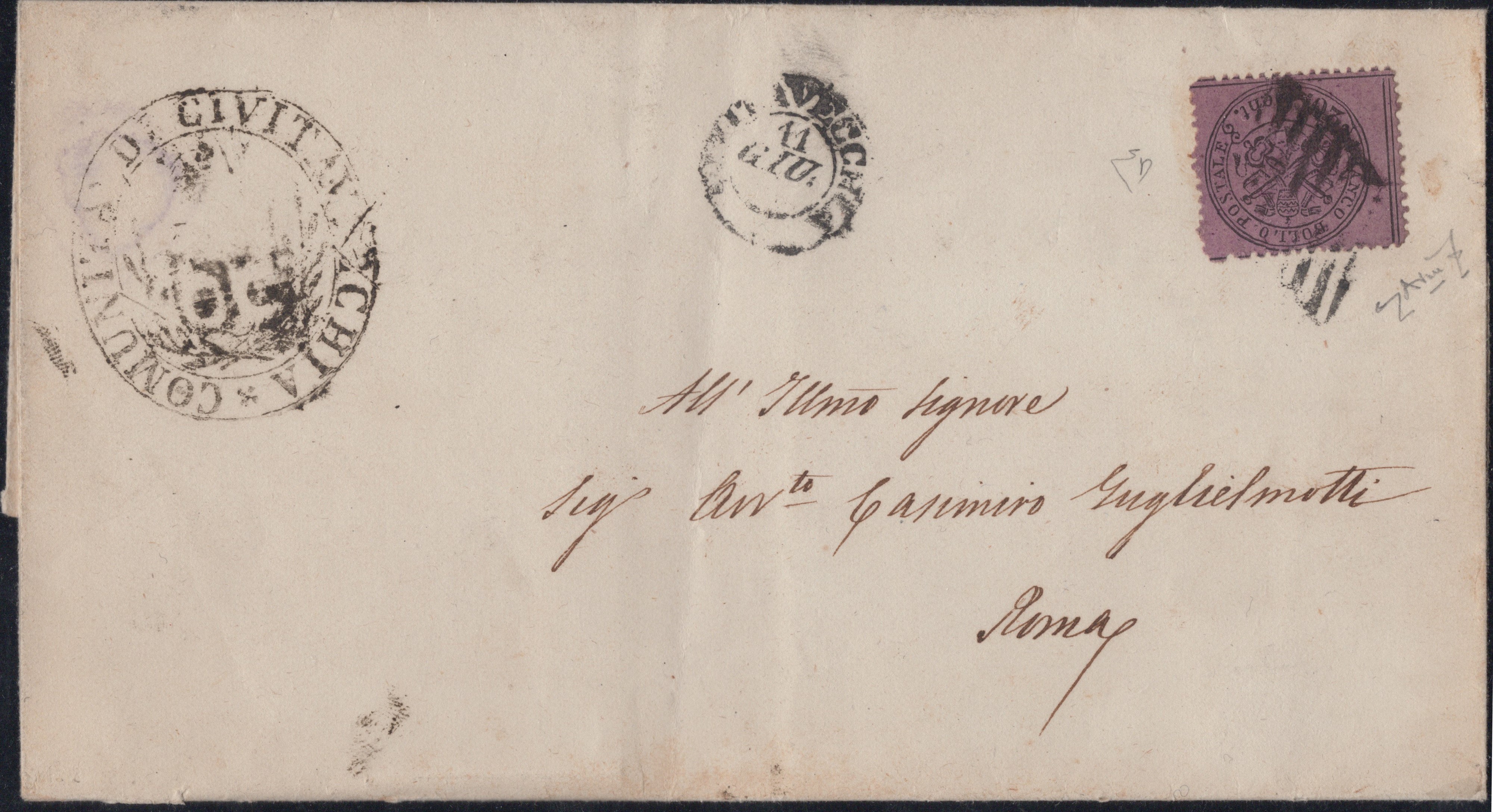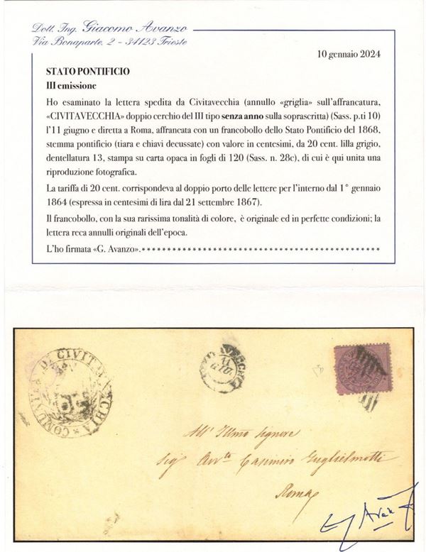 1868 - Busta da Civitavecchia per Roma affrancata tramite un 20 cent. III emissione lilla grigio n.28c. Sulla lettera il cerchio senza data di Civitavecchia (pt.10). Rarissima tonalità di colore impreziosita da un annullo poco comune. Cat. 24.800. (A+) (Cert. G.Avanzo, Enzo Diena)