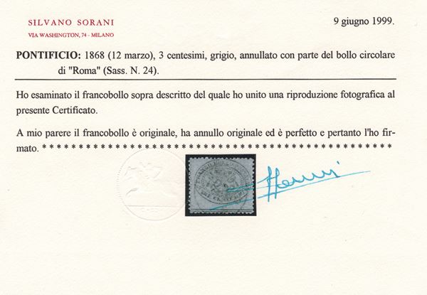 1868 - 3cent. grigio n.24 usato con annullo a cerchio. (A+) (Cert. Sorani)