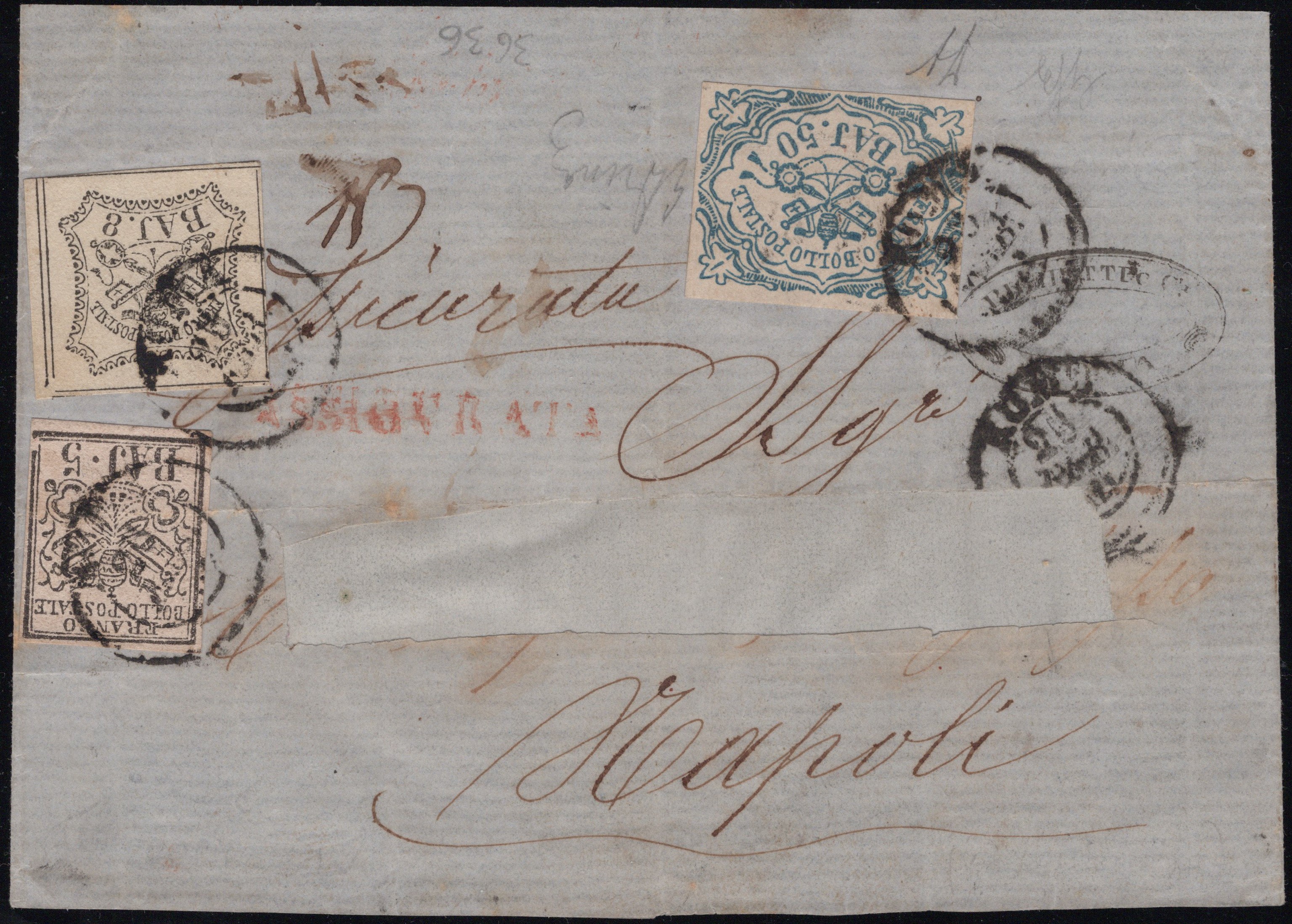 Pontificio - Storia Postale, Raccomandata da Roma per Napoli 50+8+5 baj.