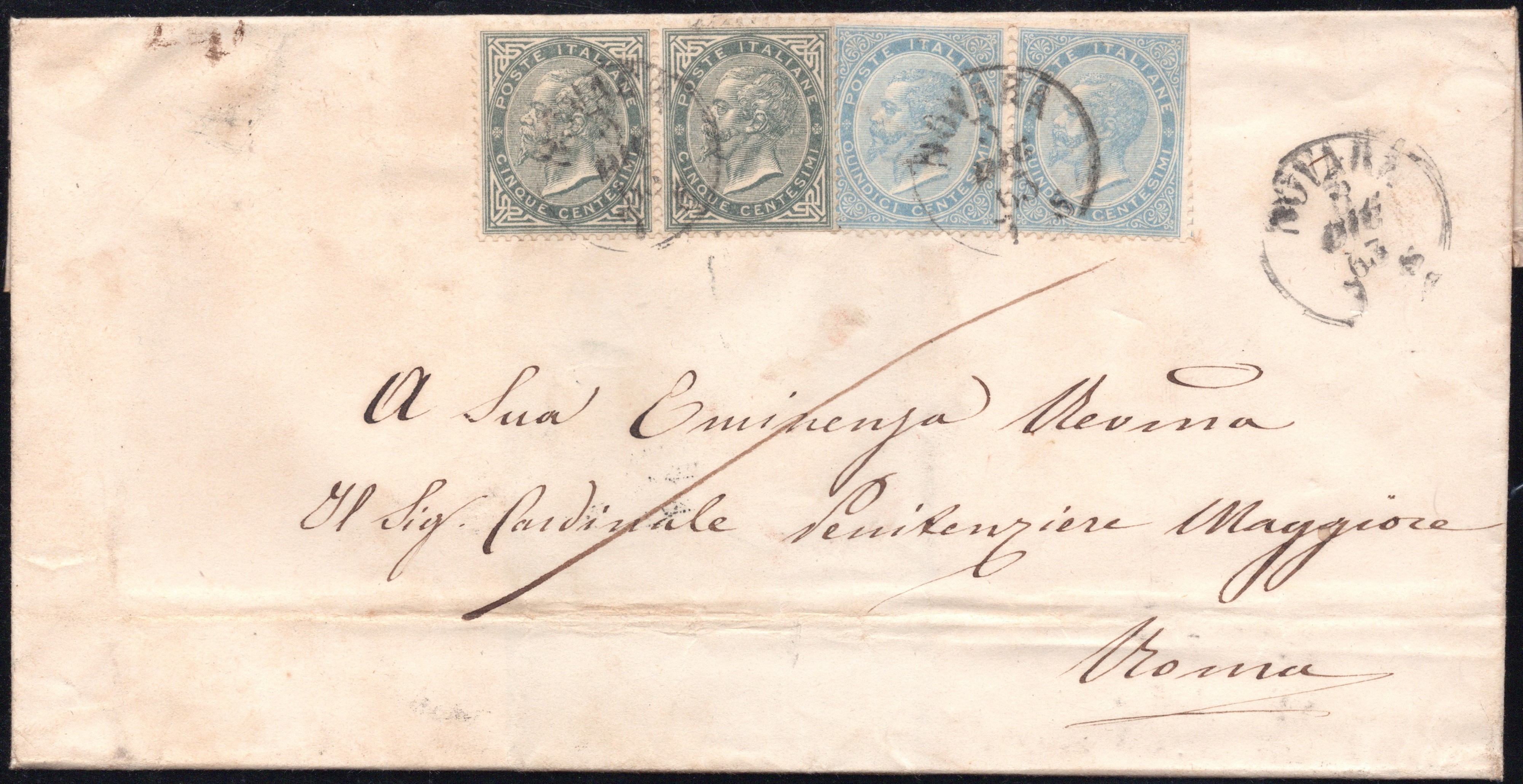03.12.1863 - Lettera spedita da Torino per Roma affrancata per 40 centesimi tramite due valori da 5 cent. grigio verde n.L16 + due valori da 15 cent. celeste chiaro n.L18 usati il terzo giorno d'emissione. Insieme non comune.