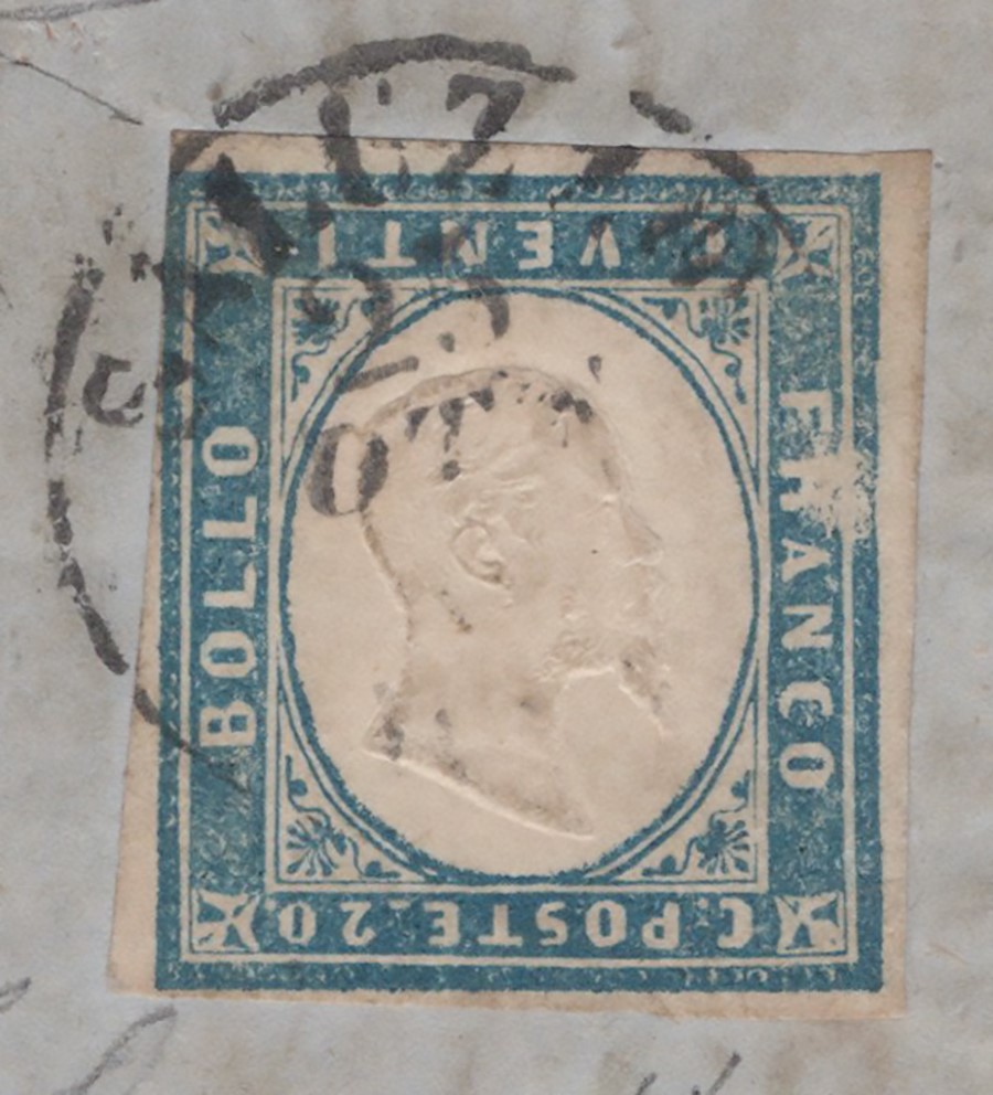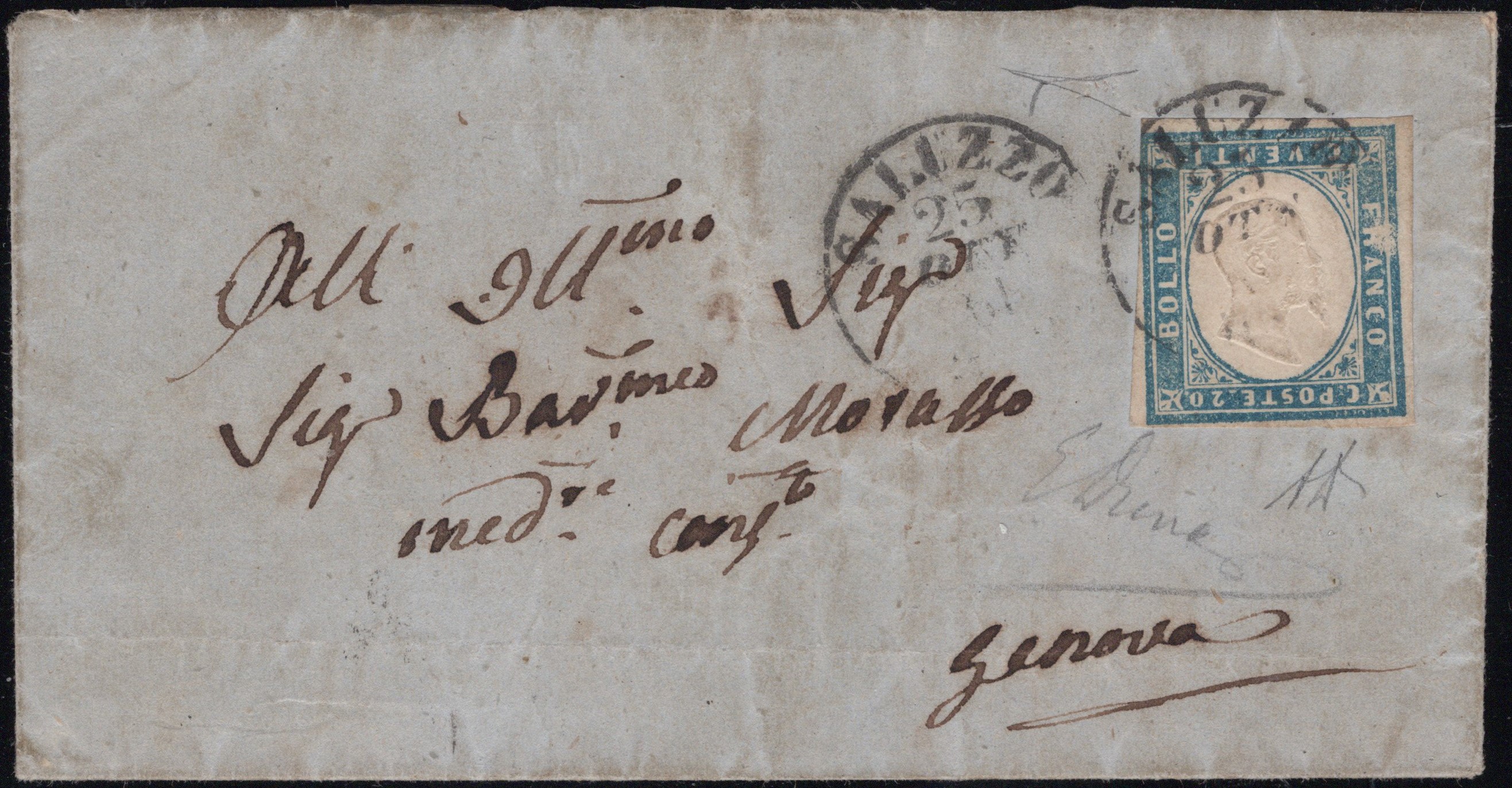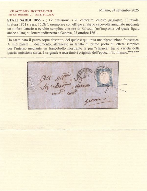 1861 - Lettera da Saluzzo per Genova affrancata tramite un 20 cent. con effige capovolta di una tonalità di colore molto interessante. Tre grandi margini, rasente a sinistra. (Cert. Bottacchi, Emilio Diena per esteso, Alberto Diena)