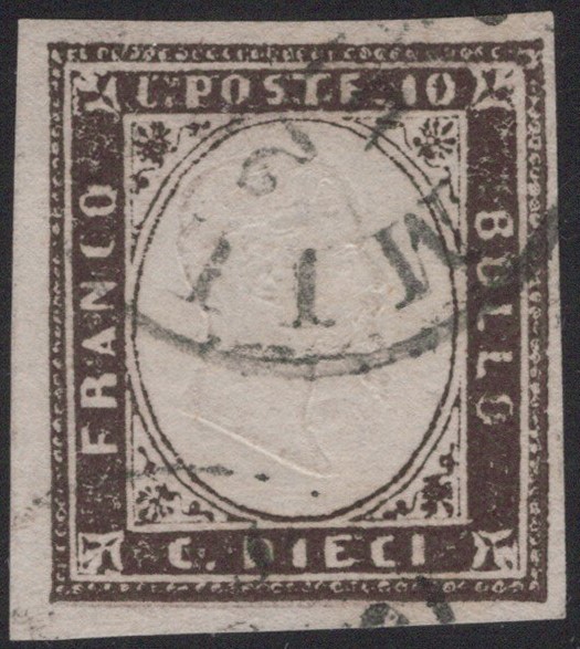 1859 - 10 cent. bruno cioccolato scuro n.14Af, molto bello. Cat.1.400. (A+)
