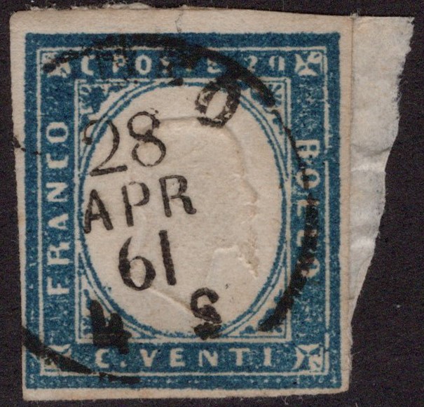 1861 - 20 cent. II tavola Cobalto Grigio Verdastro usato a Torino il 28.04.1861. Bel esemplare.