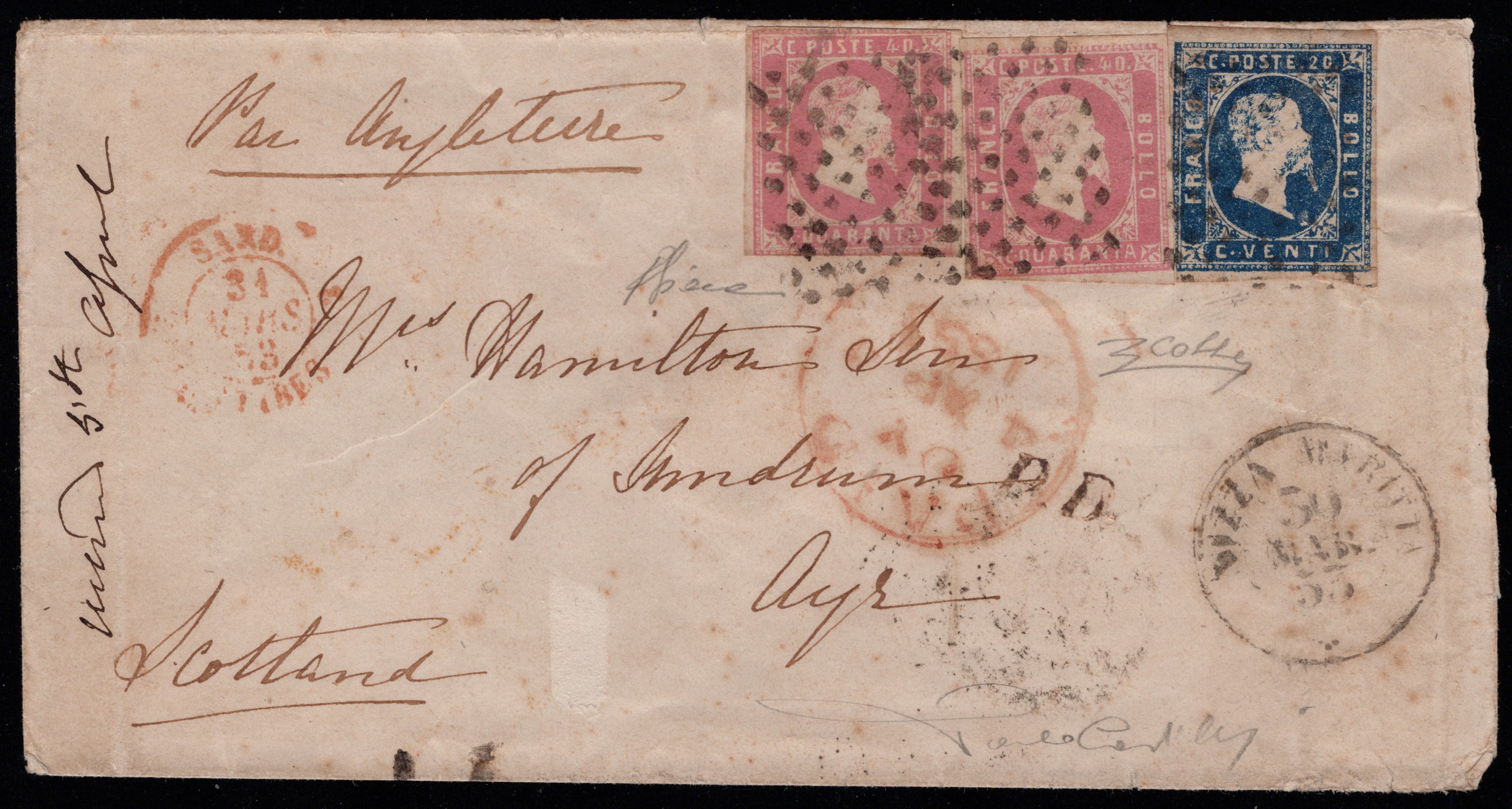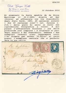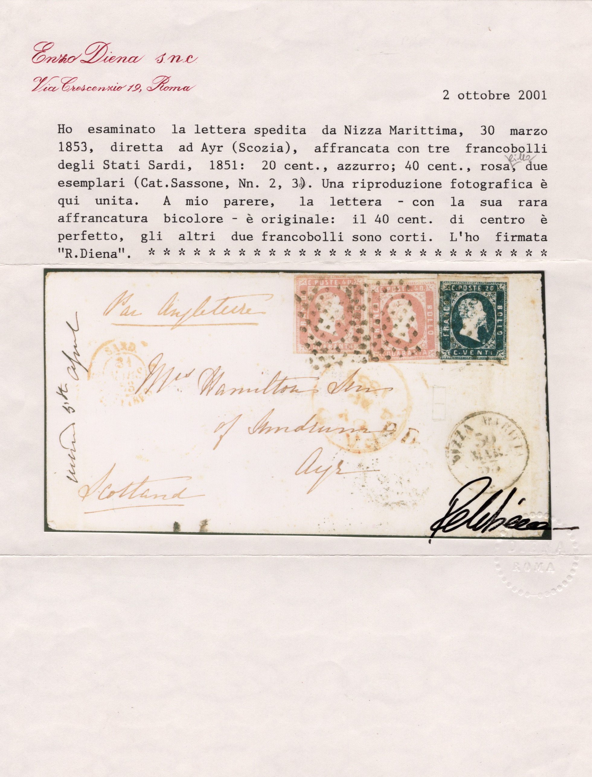 1853 - Busta spedita da Nizza Marittima per Ayr (Scozia) affrancata per 1 lira tramite un 20 cent. azzurro n.2 e due esemplari da 40 cent. rosa n.3 di cui uno molto bello con grandi margini. La rara combinazione è impreziosita dalla destinazione non comune, insieme molto raro. Cat. 165.000 euro++. (A-) (Cert. Colla, Cert. Diena)