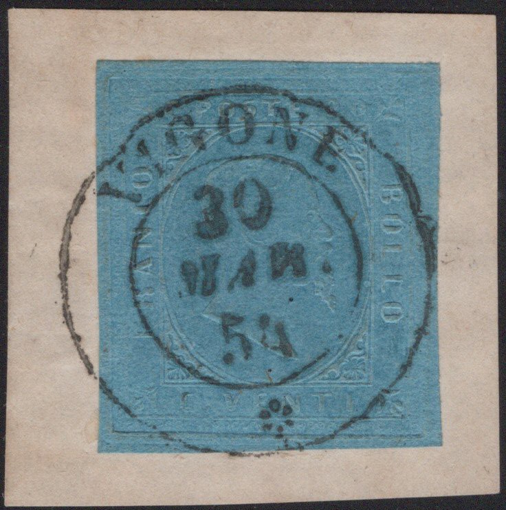 1853 - 20 cent. azzurro n.5 conservato su frammento ed annullato (pt.10). (A)