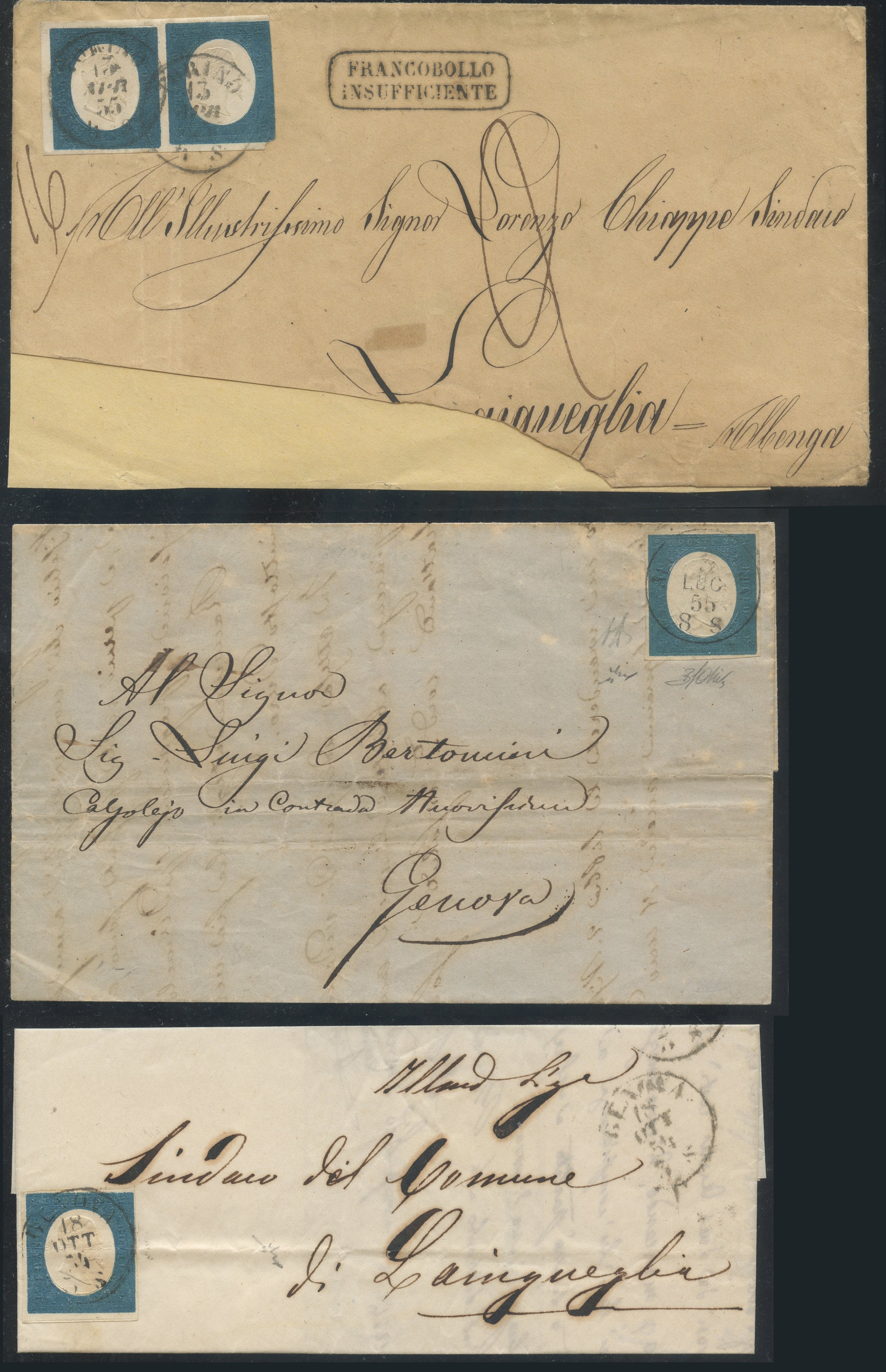 1854 - 20 cent. azzurro n.8 su tre documenti postali, interessante insieme.