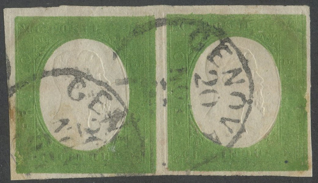 1855 - 5 cent. verde giallo n. 7 in coppia, usata. Cat. 2.600. (A-)