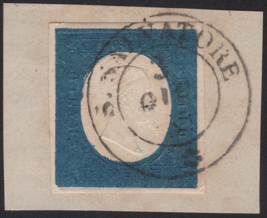 1857 - 20 cent. azzurro n.8 conservato su frammento ed annullato a S. Salvatore (pt.10). Splendido insieme. (A+)