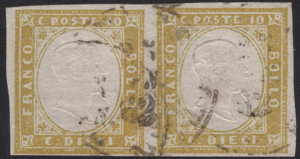 1862 - 10 cent. giallo olivastro n.14Dc in una varietà di colore particolarmente pregiata. Molto rara la coppia di questo valore. Cat. 7.500++. (A+)