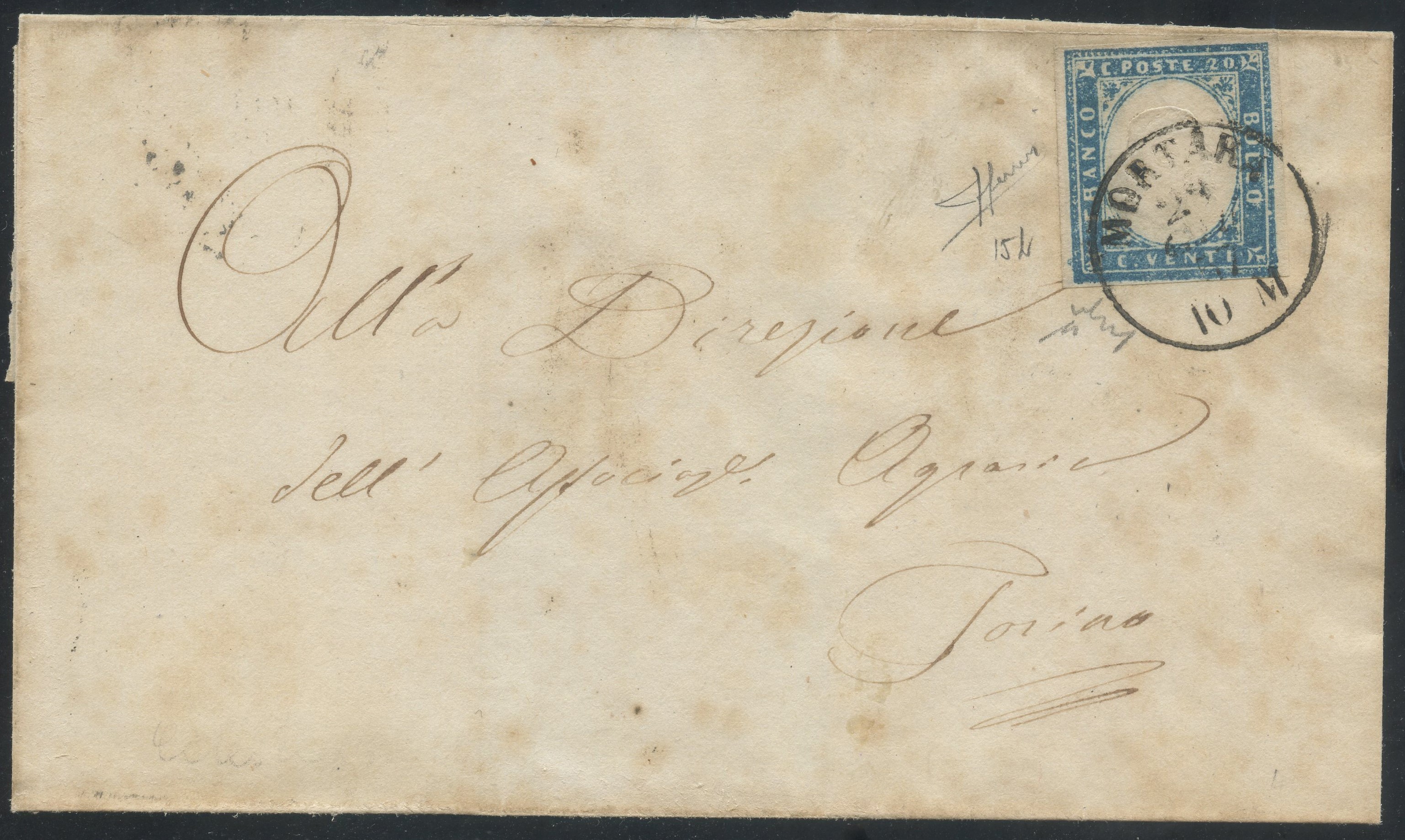 Sardegna - IV emissione, 20 cent. cobalto su busta da MORTARA per Torino