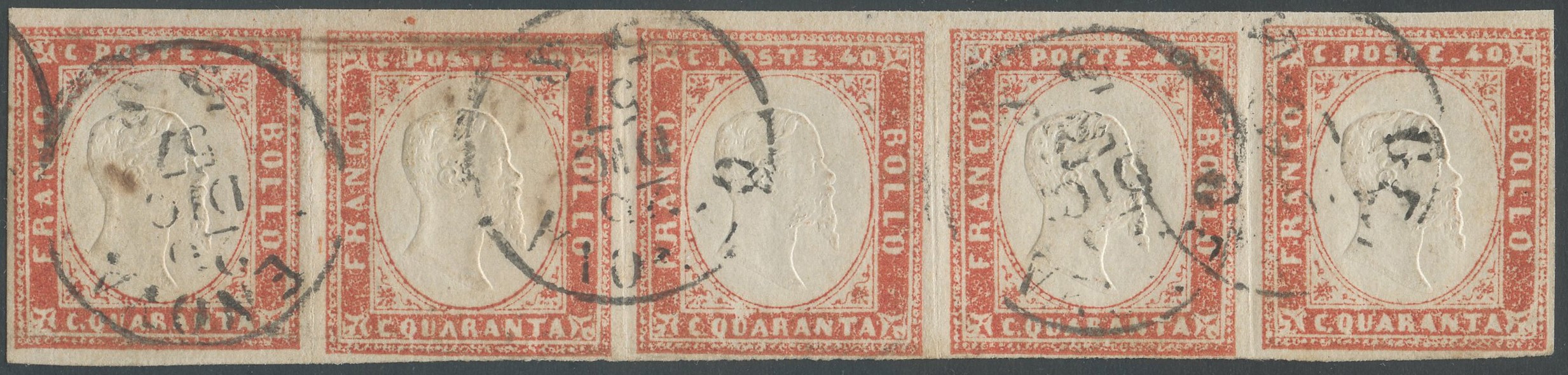 1857 - 40 cent. rosso scarlatto chiaro n.16Aa in striscia di 5. Estremamente rara da reperire con tutti i margini completi. (A+)