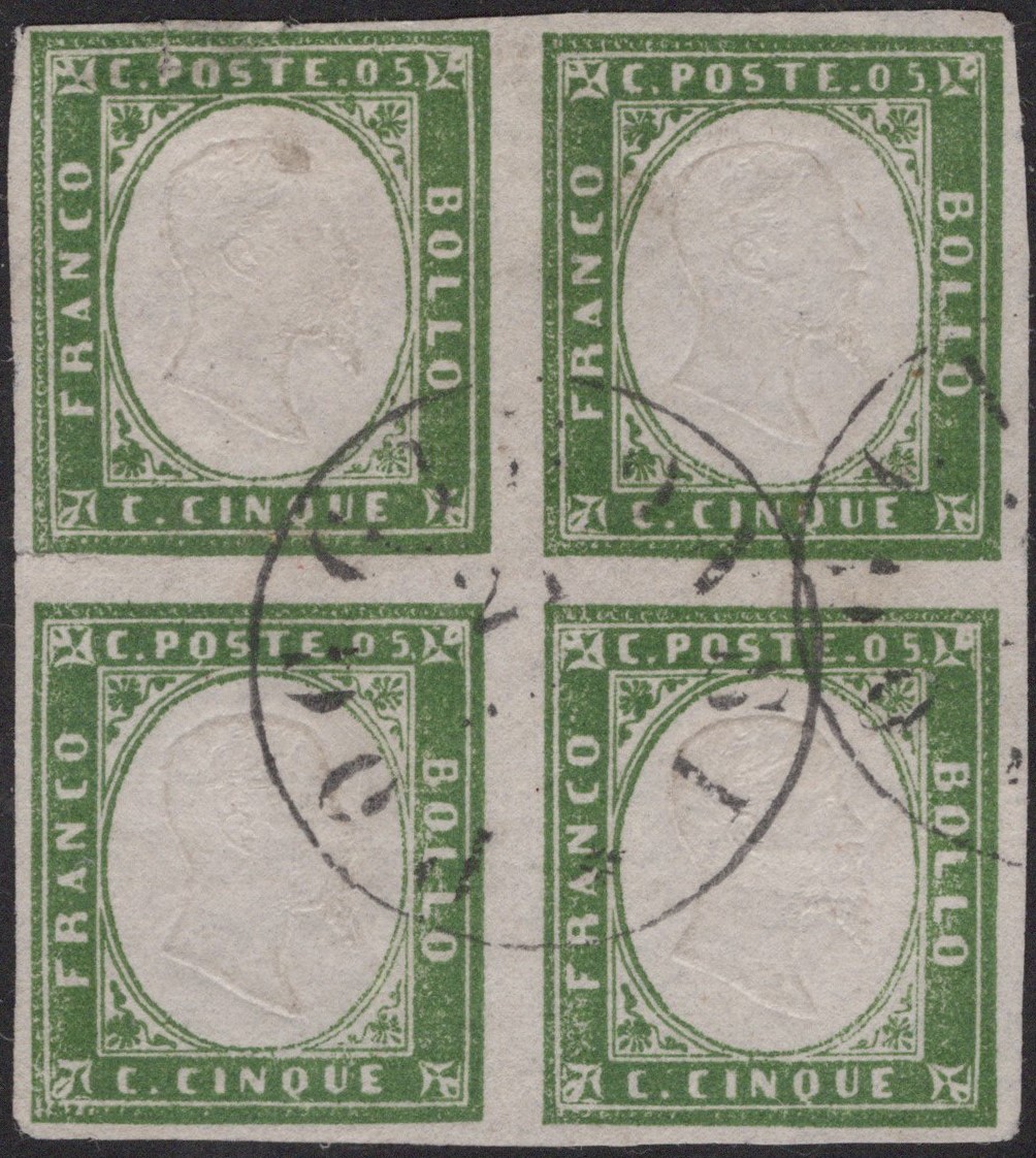 1863 - 5 cent. verde n. 13Ea in quartina usata a Radiocofani, ottimo aspetto e perfetta ad eccezione dell'esemplare in alto a sinistra che ha un piccolo difetto. Cat.11.000++. (A-) (Raybaudi)