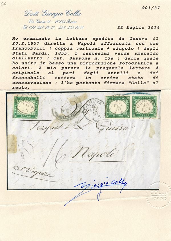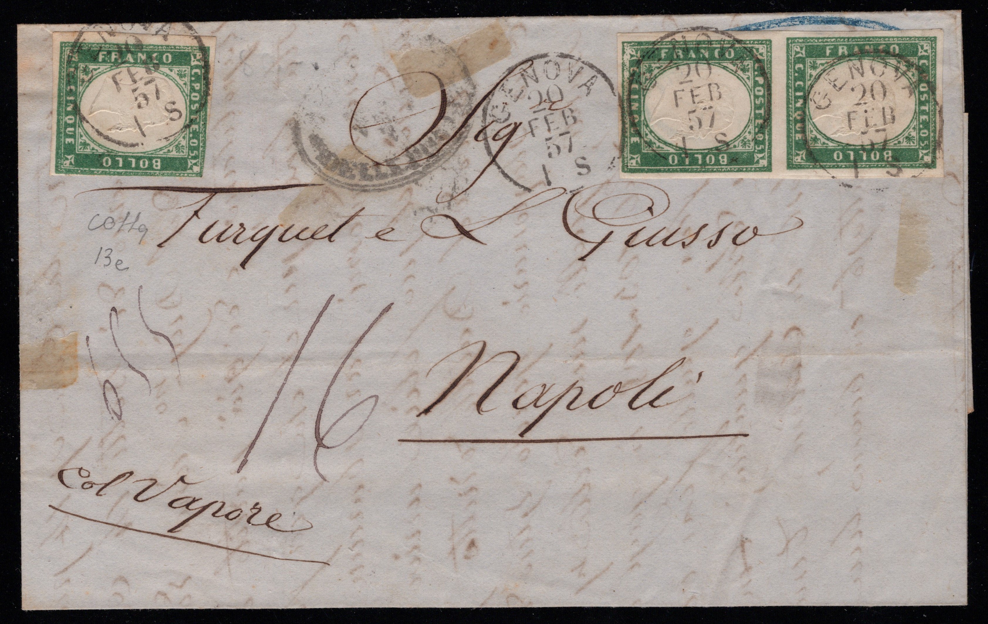 1857 - Lettera spedita da Genova per Napoli affrancata per 15 cent. tramite tre esemplari (un singolo più una coppia) del 5 cent. verde smeraldo giallastro n.13e. La coppia è di qualità Lusso con margini molto grandi e freschissima mente il singolo ha un margine toccato. Insieme molto bello. provenienza asta Italphil. cat. 13.500++. (A-) (Cert. Colla).
