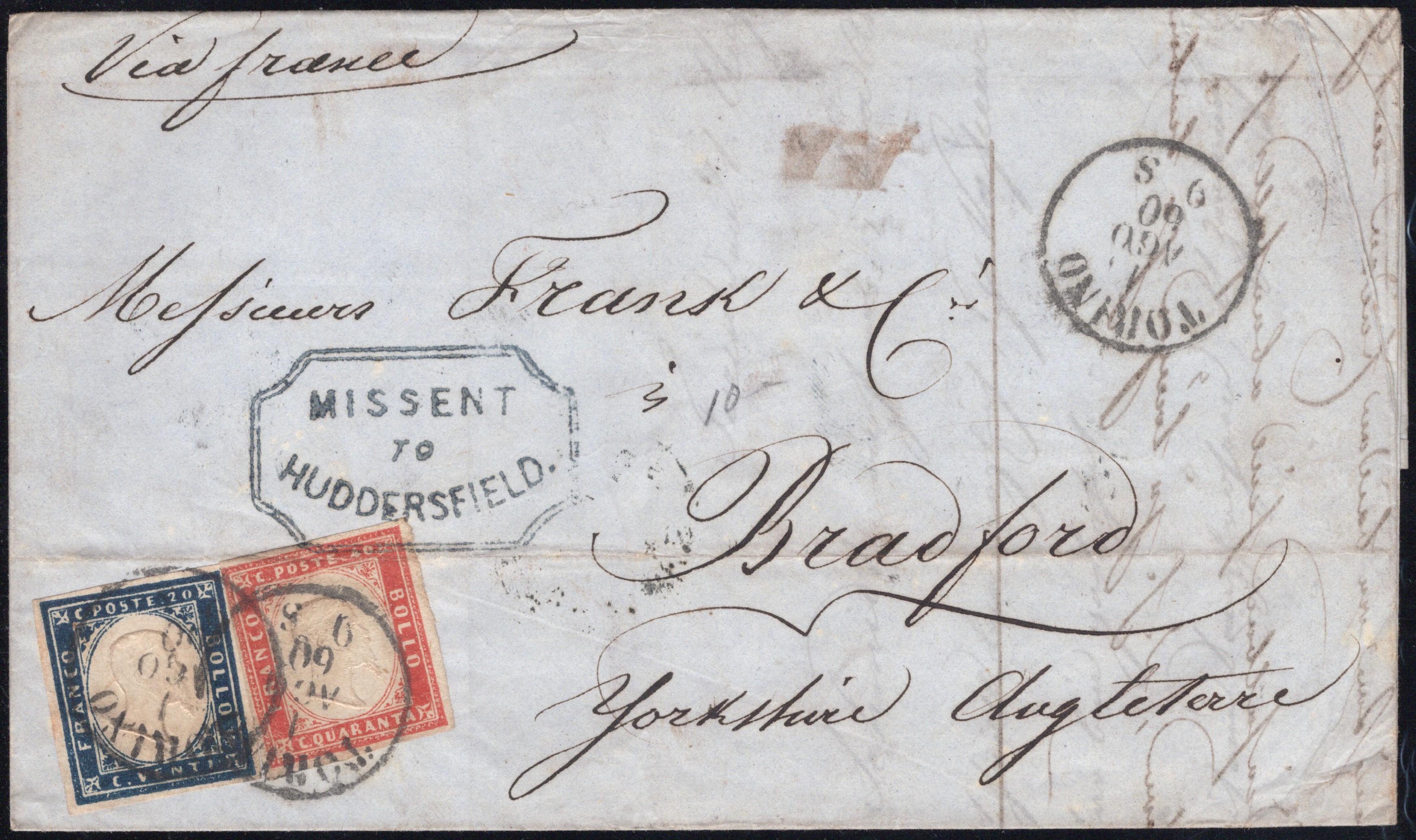 01.08.1860 - Busta spedita da Torino per Bradford (Inghilterra), via di Francia, affrancata per 60 centesimi tramite un 20 cent. azzurro scuro n.15B + 40 cent. vermiglio mattone n.16Ba. Piega d'archivio. Cat.2.200. (A-)