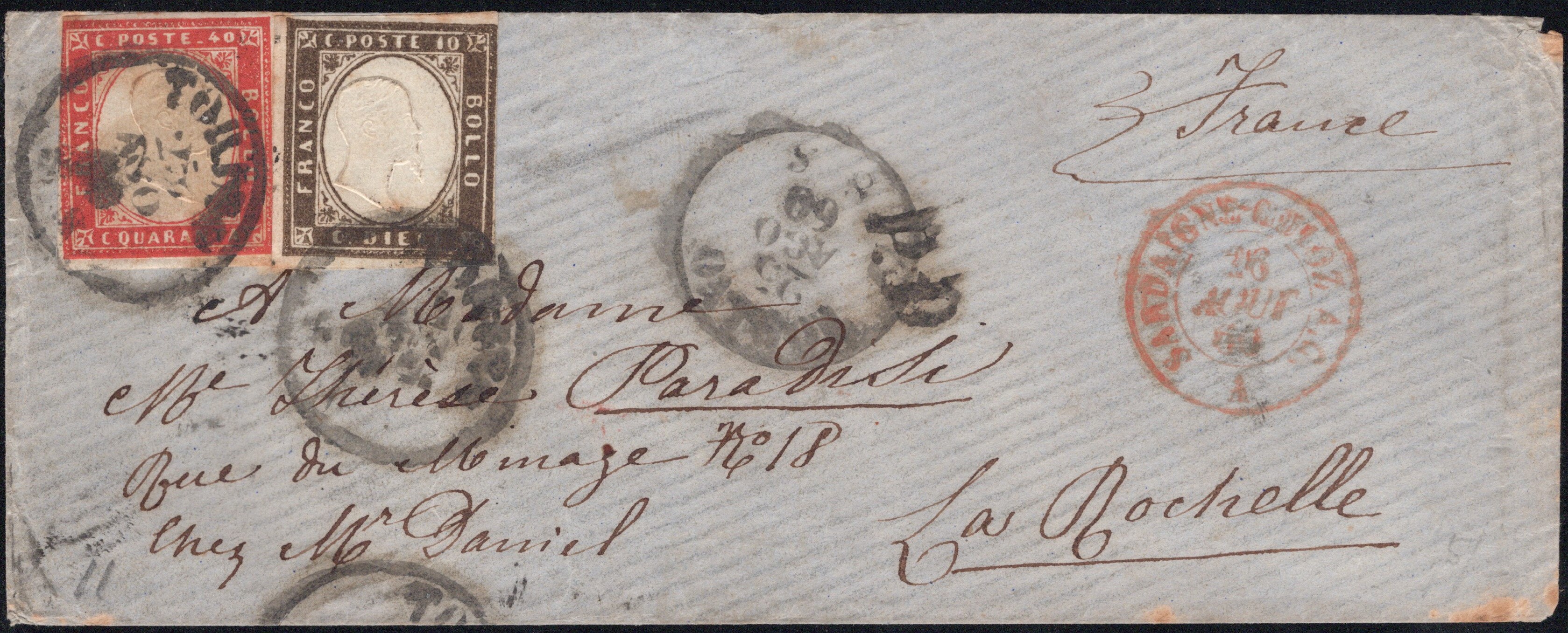 25.08.1860 - Busta da Torino per la Francia affrancata per 50 centesimi tramite un 10 cent. bruno olivastro scuro n.14Bd (Margine destro a filo ma completo) + 40 cent. rosso n. 16C toccato a sinistra. Cat. 4.600. (A-)