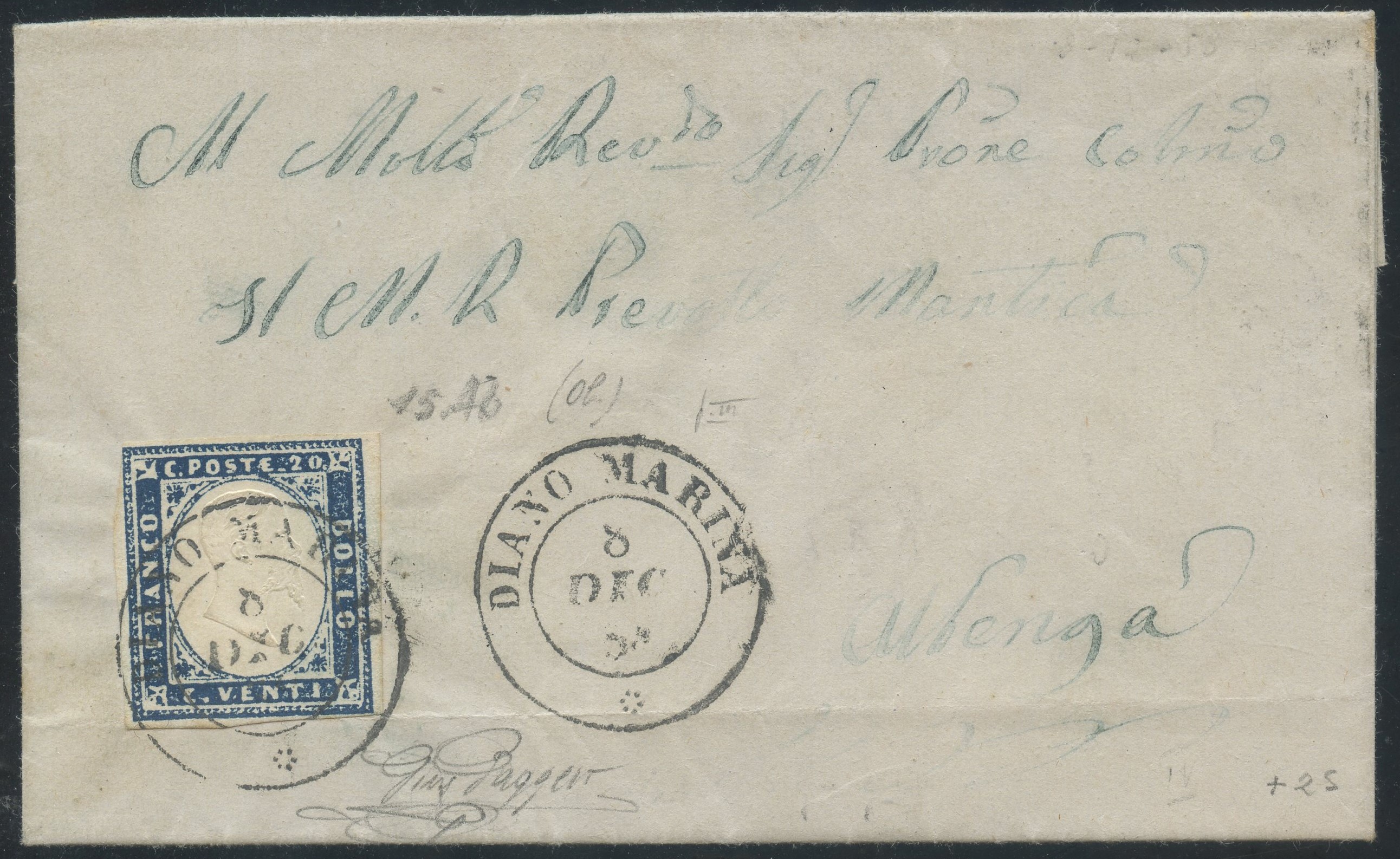 08.12.1858 - Lettera di piccolo formato da Diano Marina per Albenga affrancata tramite un 20 cent. indaco n.15Ab. Sull'affrancatura il DC di Diano Marina. (A)
