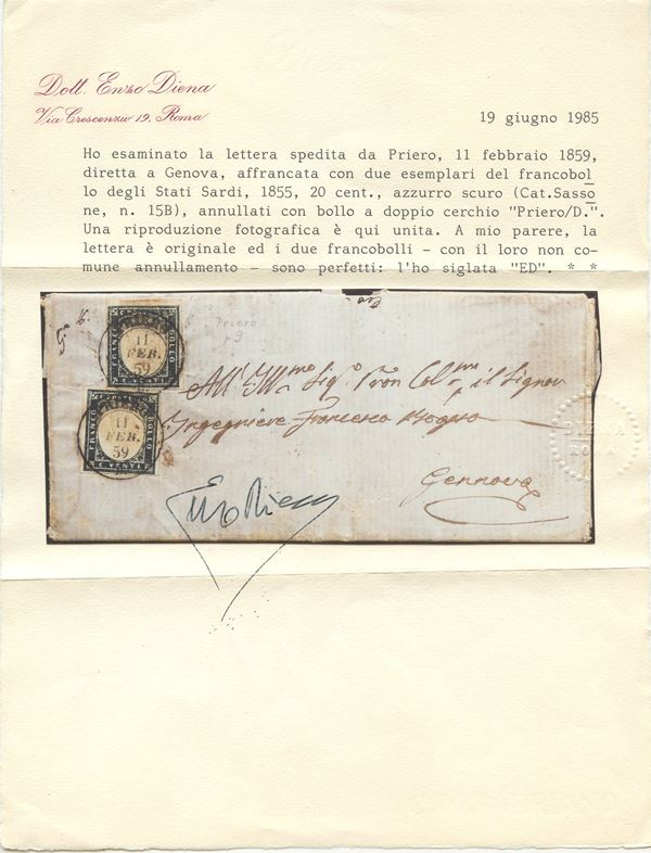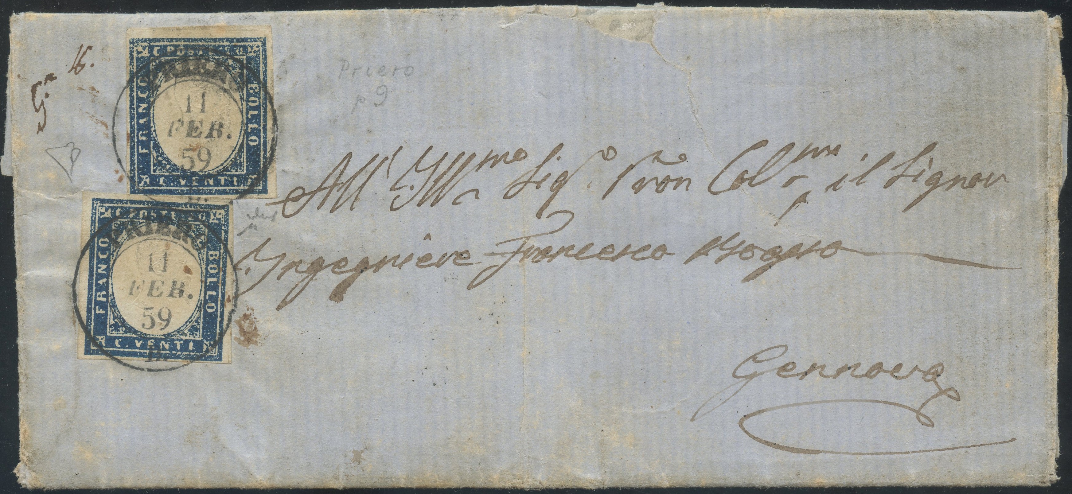 11.02.1859 - Lettera da Priero per Genova affrancata per 40 cent. tramite due valori da 20 cent. azzurro scurissimo n.15C. Sull'affrancatura il DC di PIRERO (9pt.). (A+) (Cert. Enzo Diena)