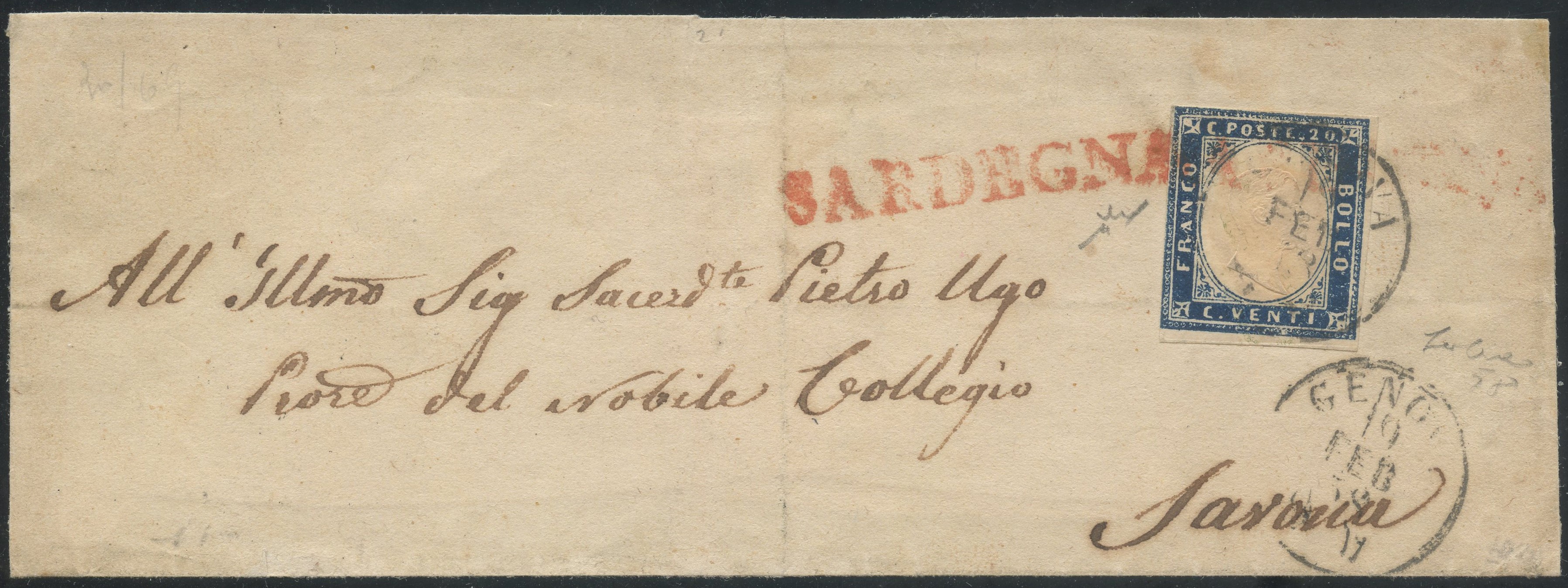 19.02.1858 - Busta proveniente dalla Sardegna per Genova ed annullata in arrivo sia tramite lo stampatello diritto ''SARDEGNA'' (9pt.), che veniva impresso sulle missive viaggiate via di mare provenienti dall'isola) e tramite il cerchio semplice di Genova. (A) (Chiavarello).
