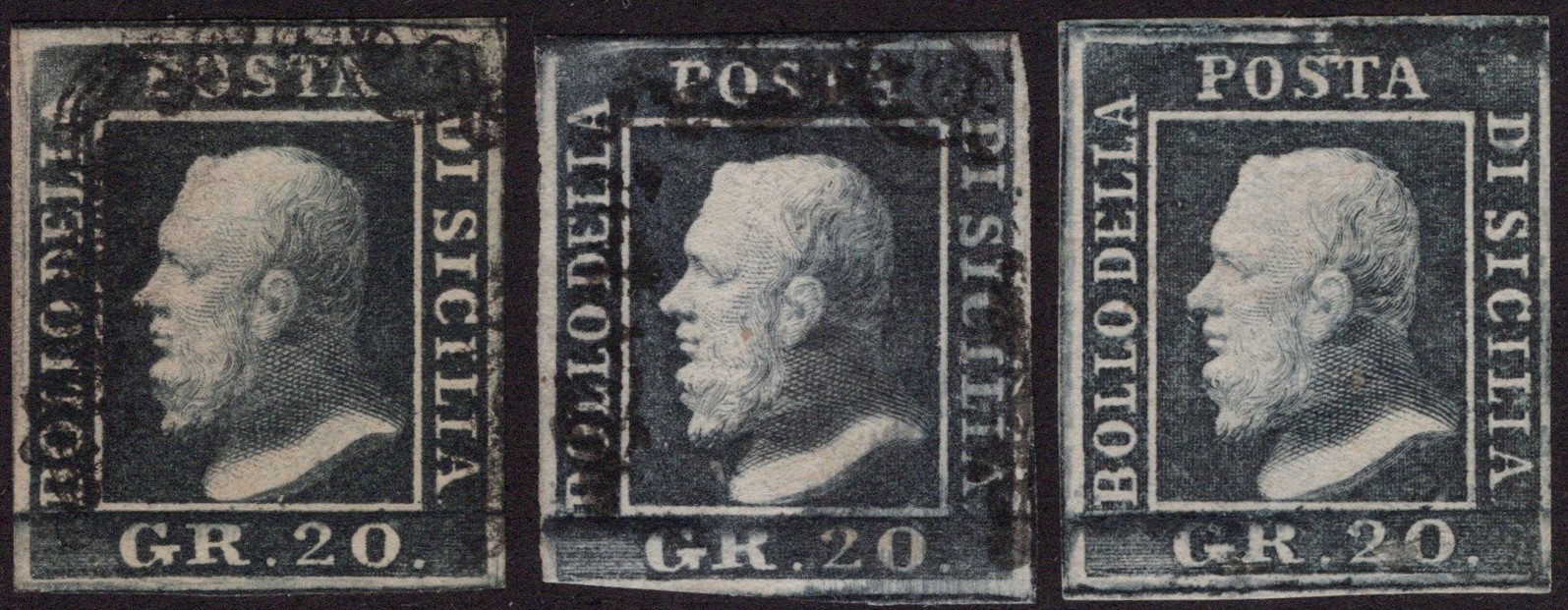 1859 - 20gr. in tre diverse tonalità di colore, due esemplari usati ed uno nuovo con gomma, linguellato. (A+)
