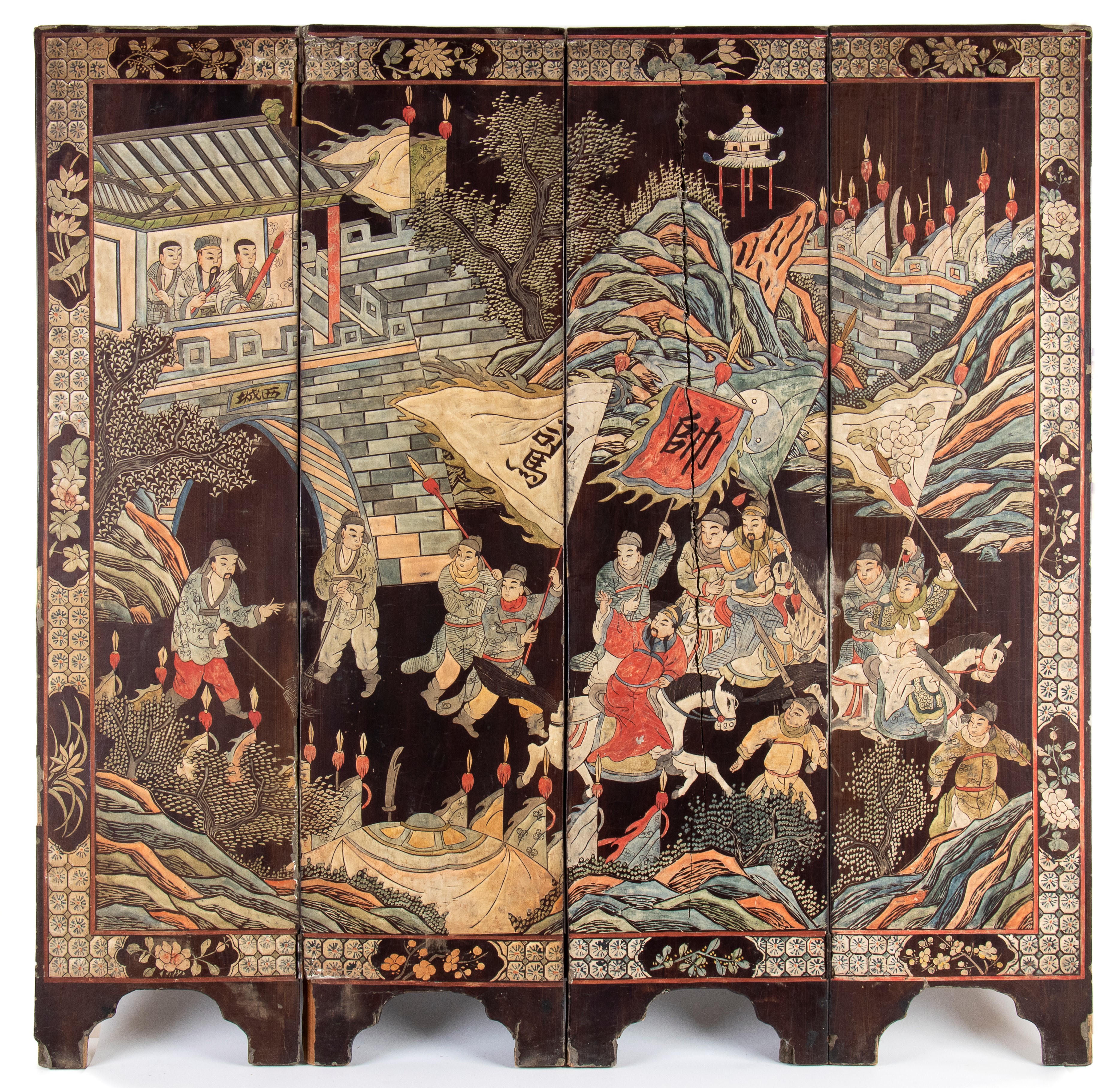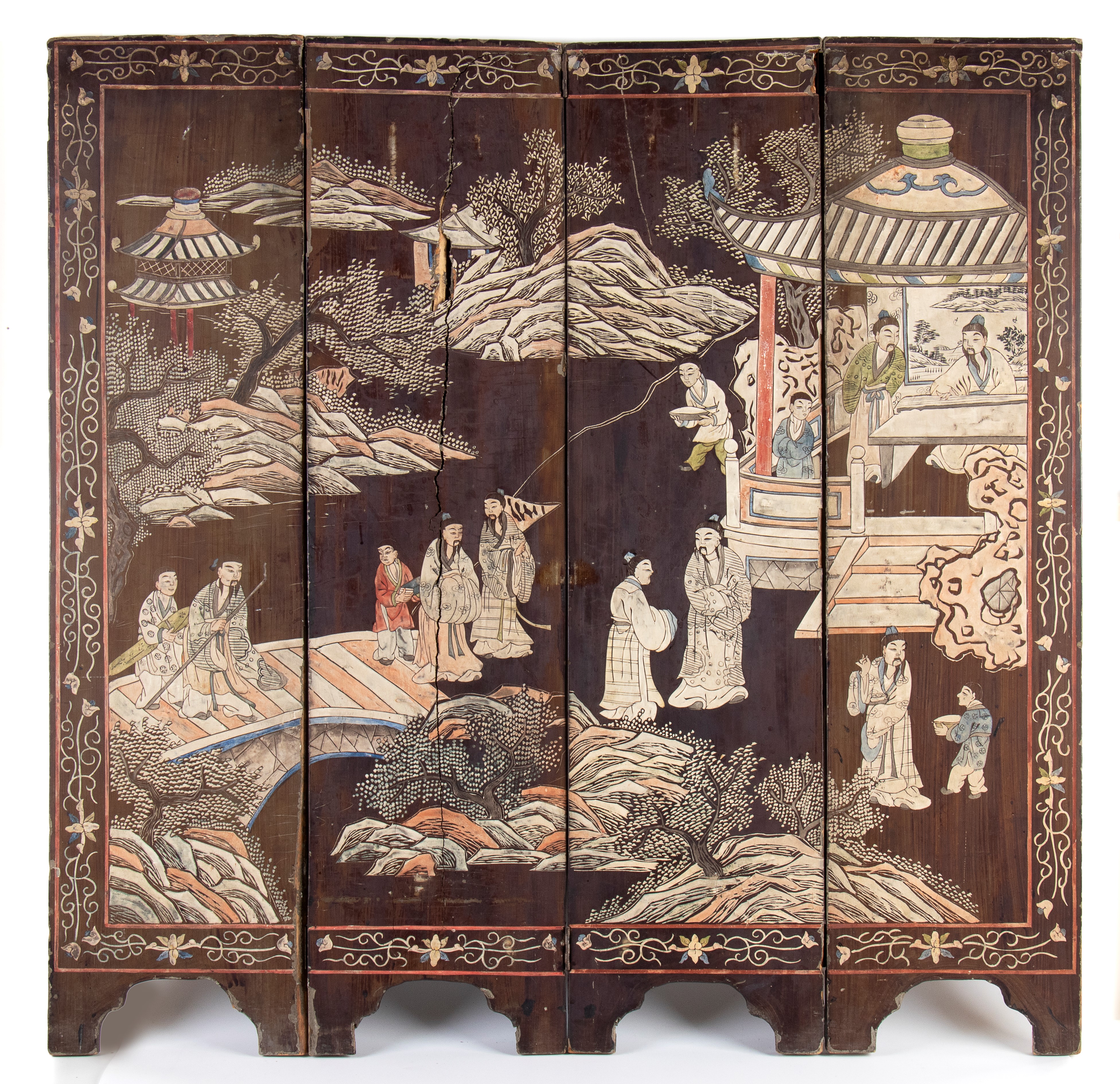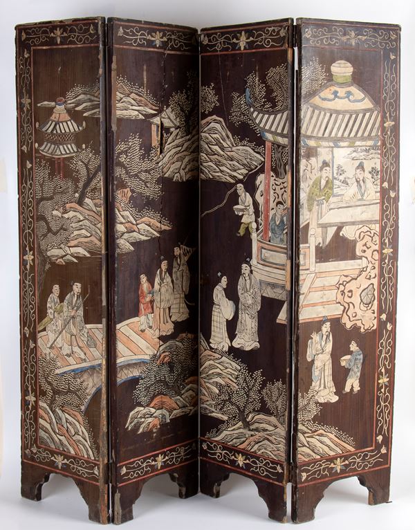Bel paravento a quattro pannelli in lacca Coromandel, Cina, Fine dinastia Qing-periodo Repubblica (1912-1949)