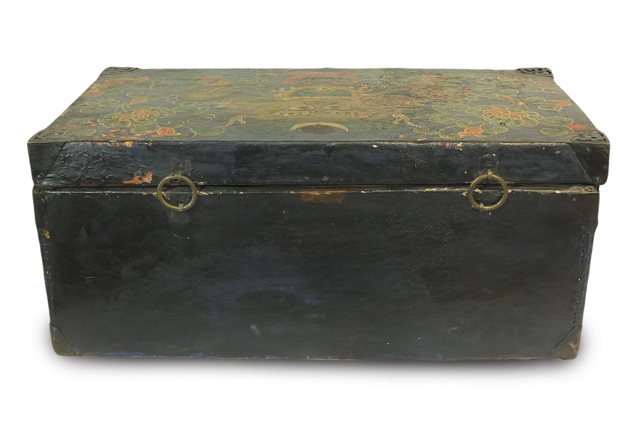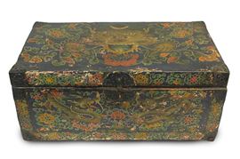 Cassa tibetana in legno ricoperta di cuoio e lacca dipinta con motivi floreali e draghi, serramento in ferro decorato.