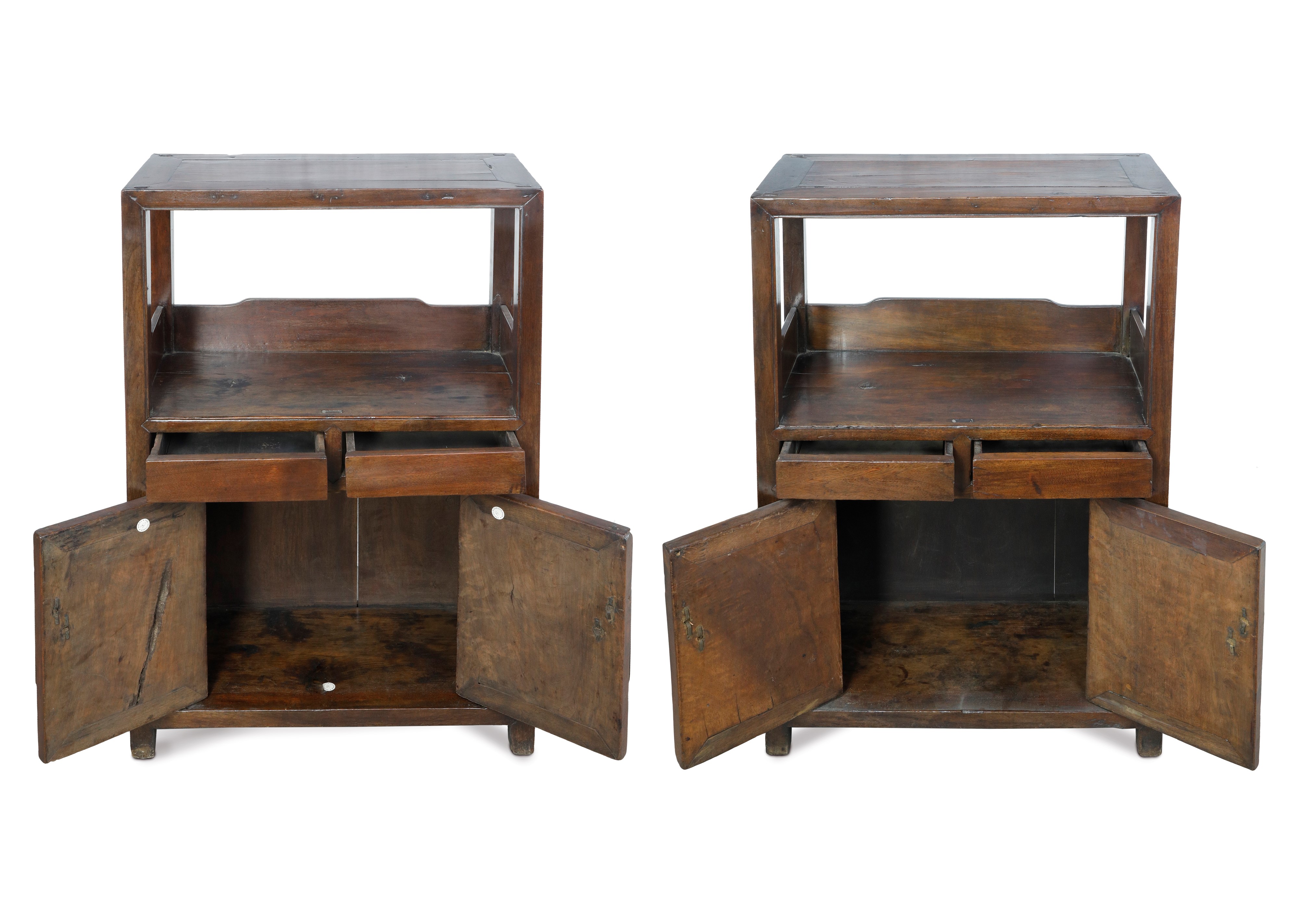 Coppia di credenze in legno di noce con ferramenta in ottone e costruzione a giunto smussato, ciascuna con ripiano aperto superiore, due piccoli cassetti e un corpo inferiore a due ante.