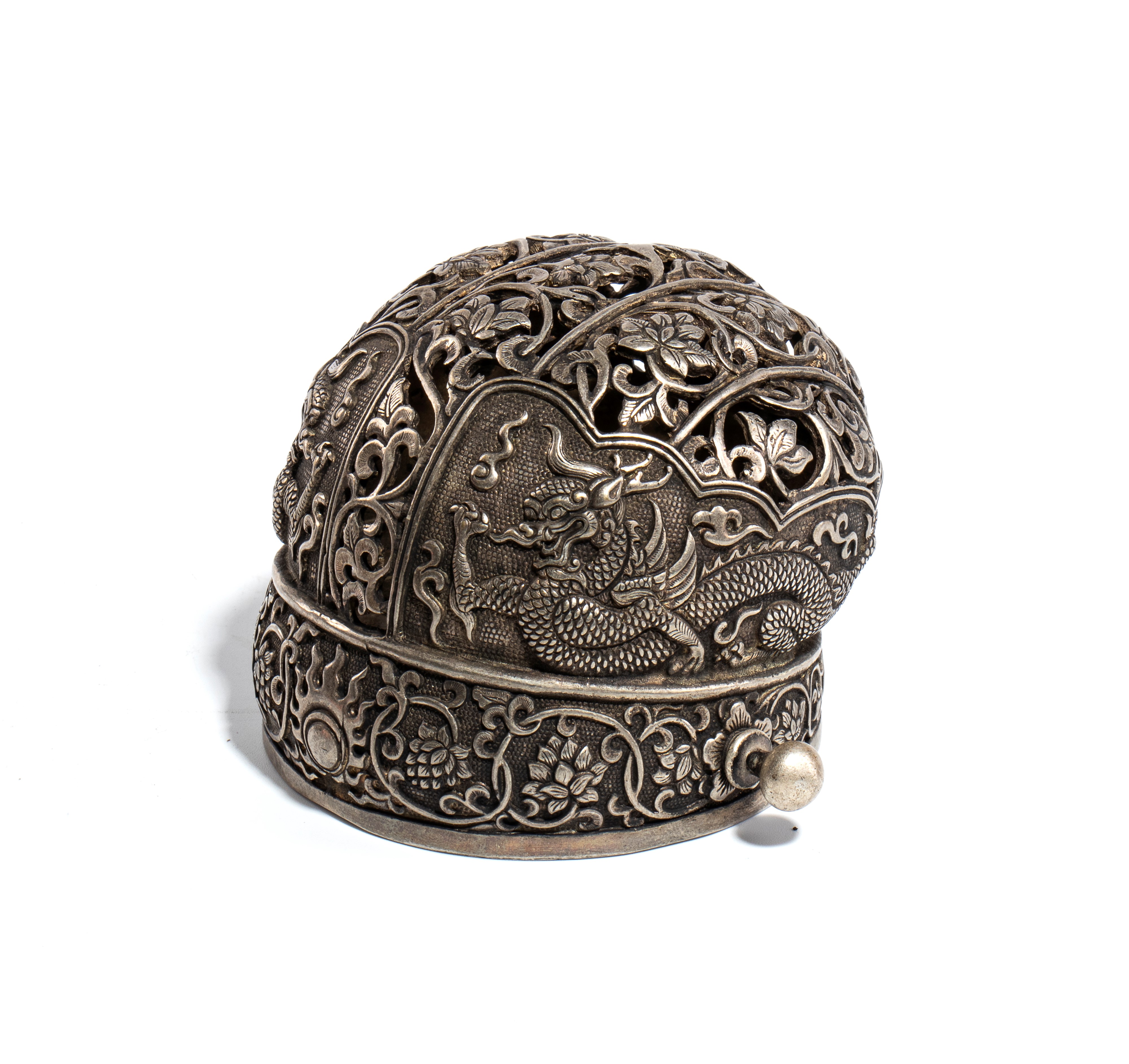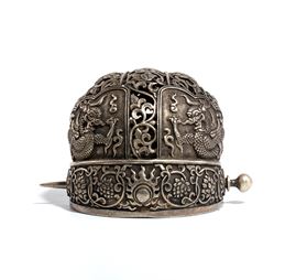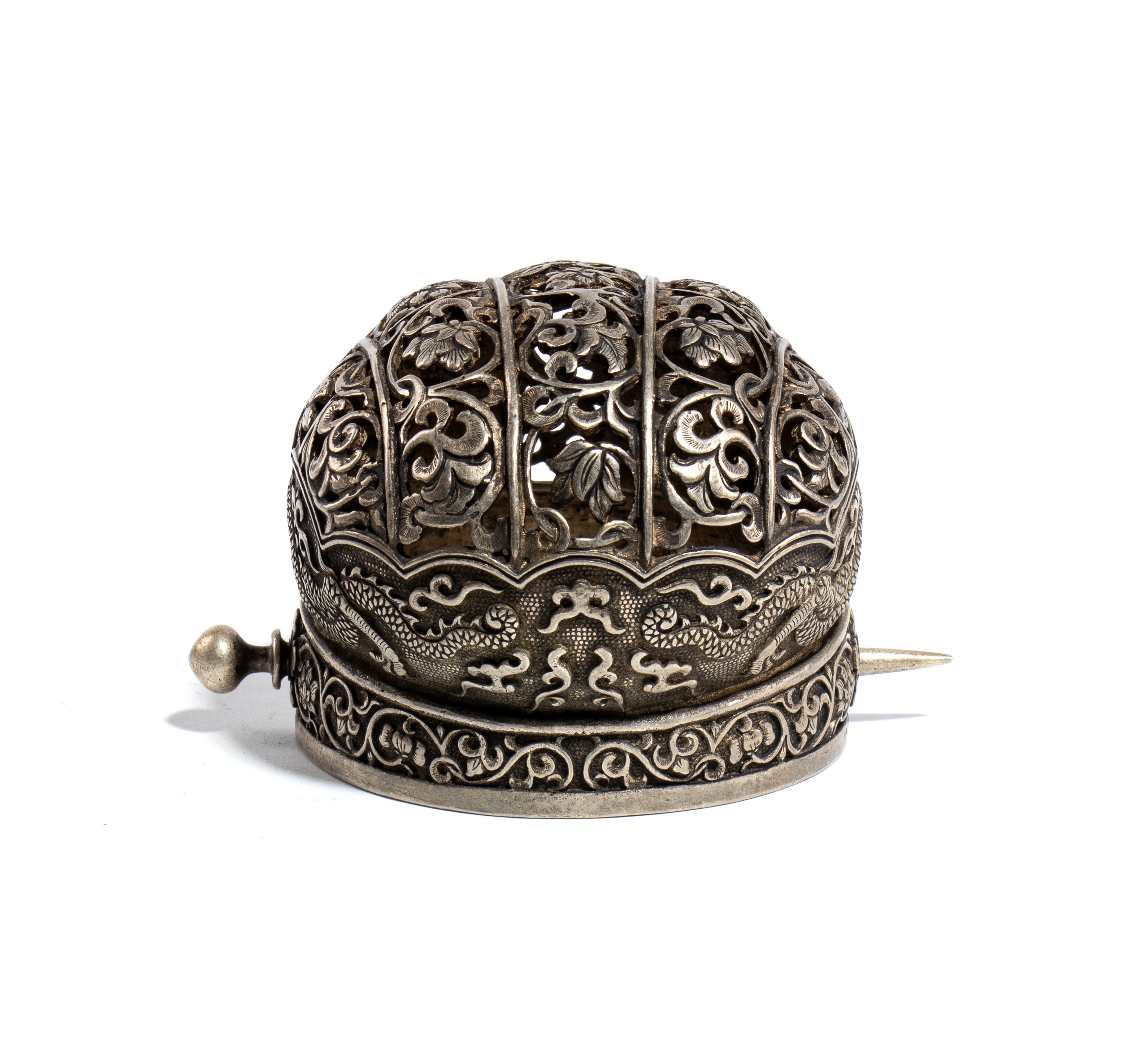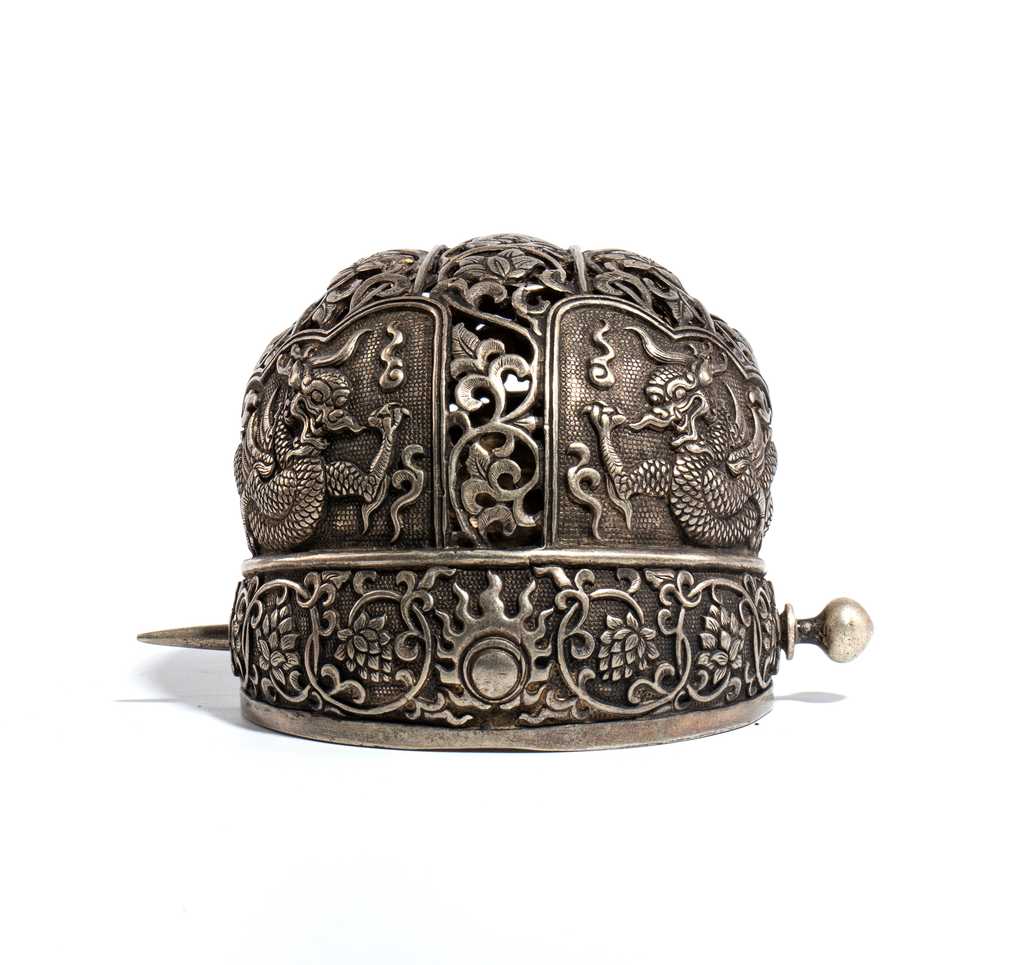 Diadema per capelli in rame, riccamente decorato con drago e motivi floreali.