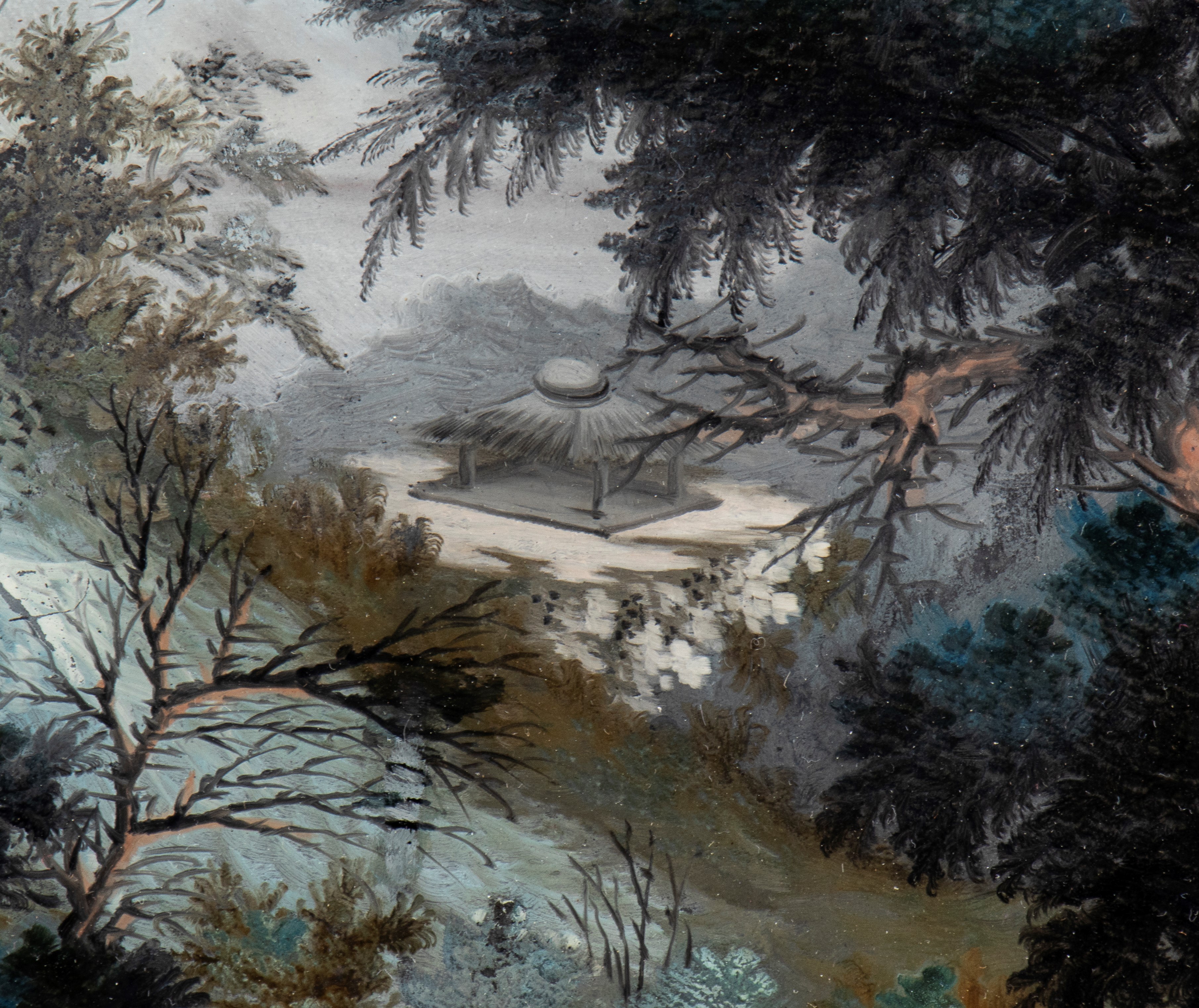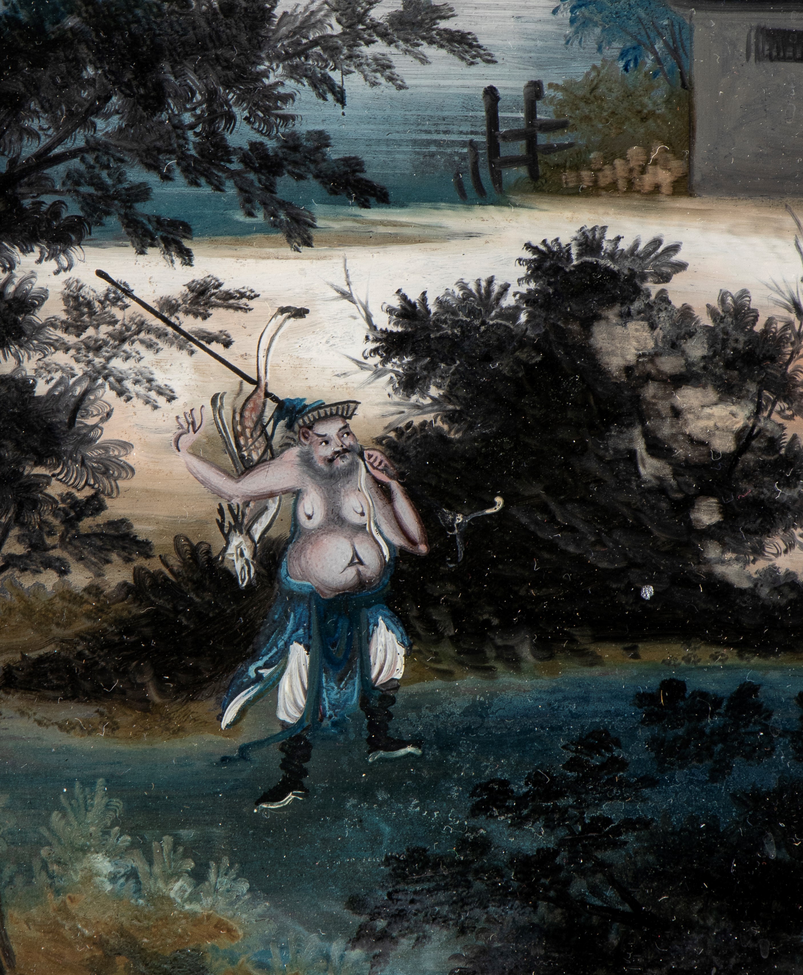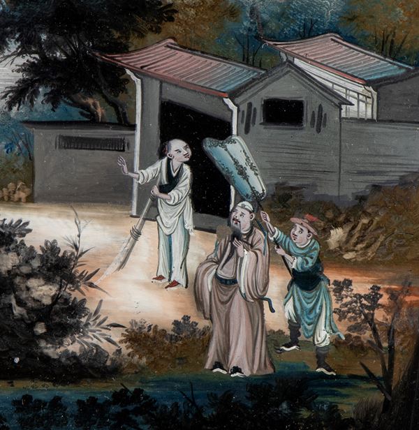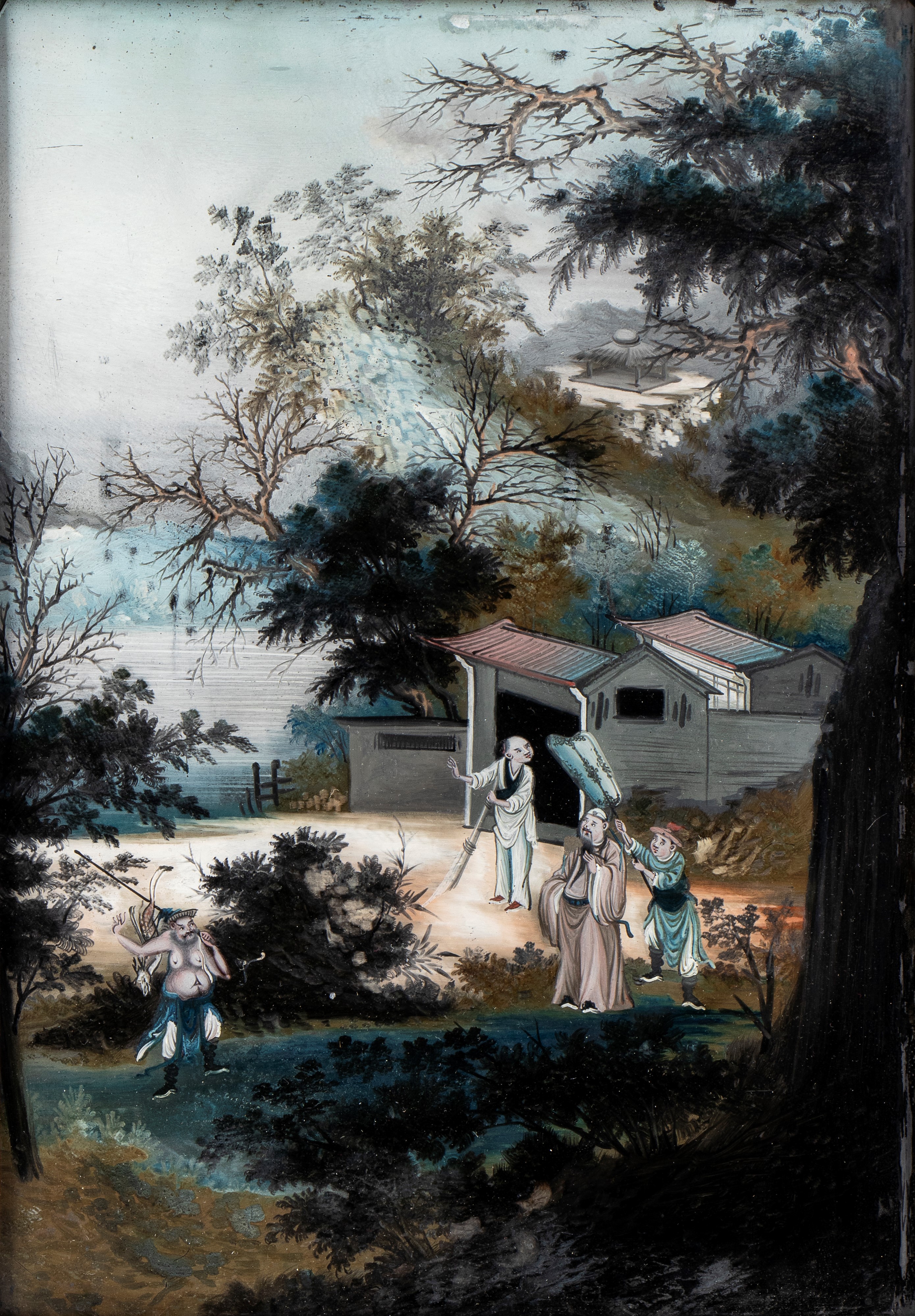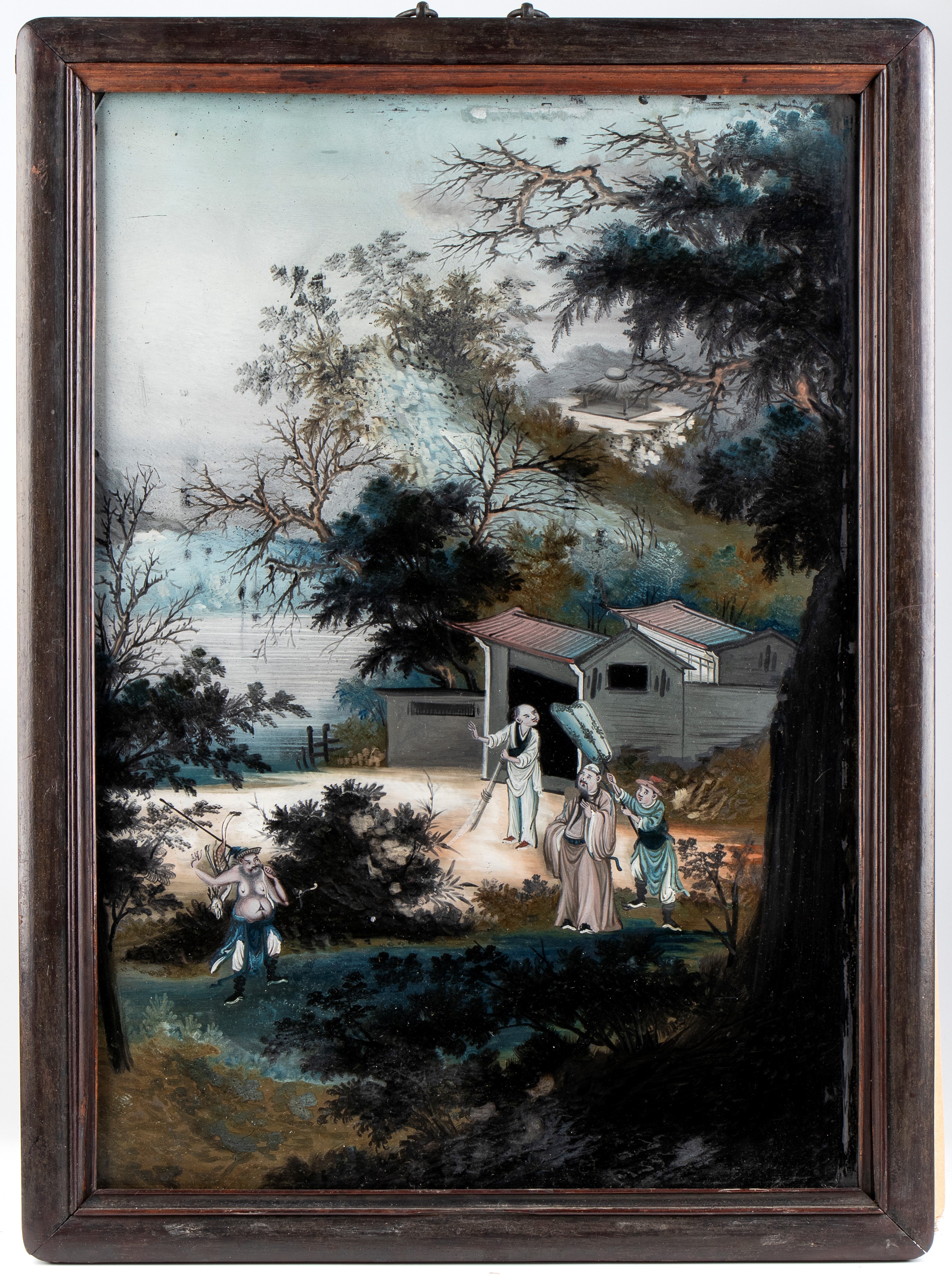 Dipinto su vetro rovesciato con cornice raffigurante figure in un paesaggio tradizionale.