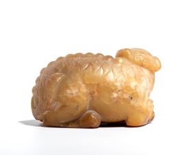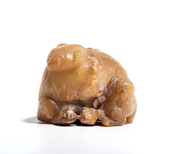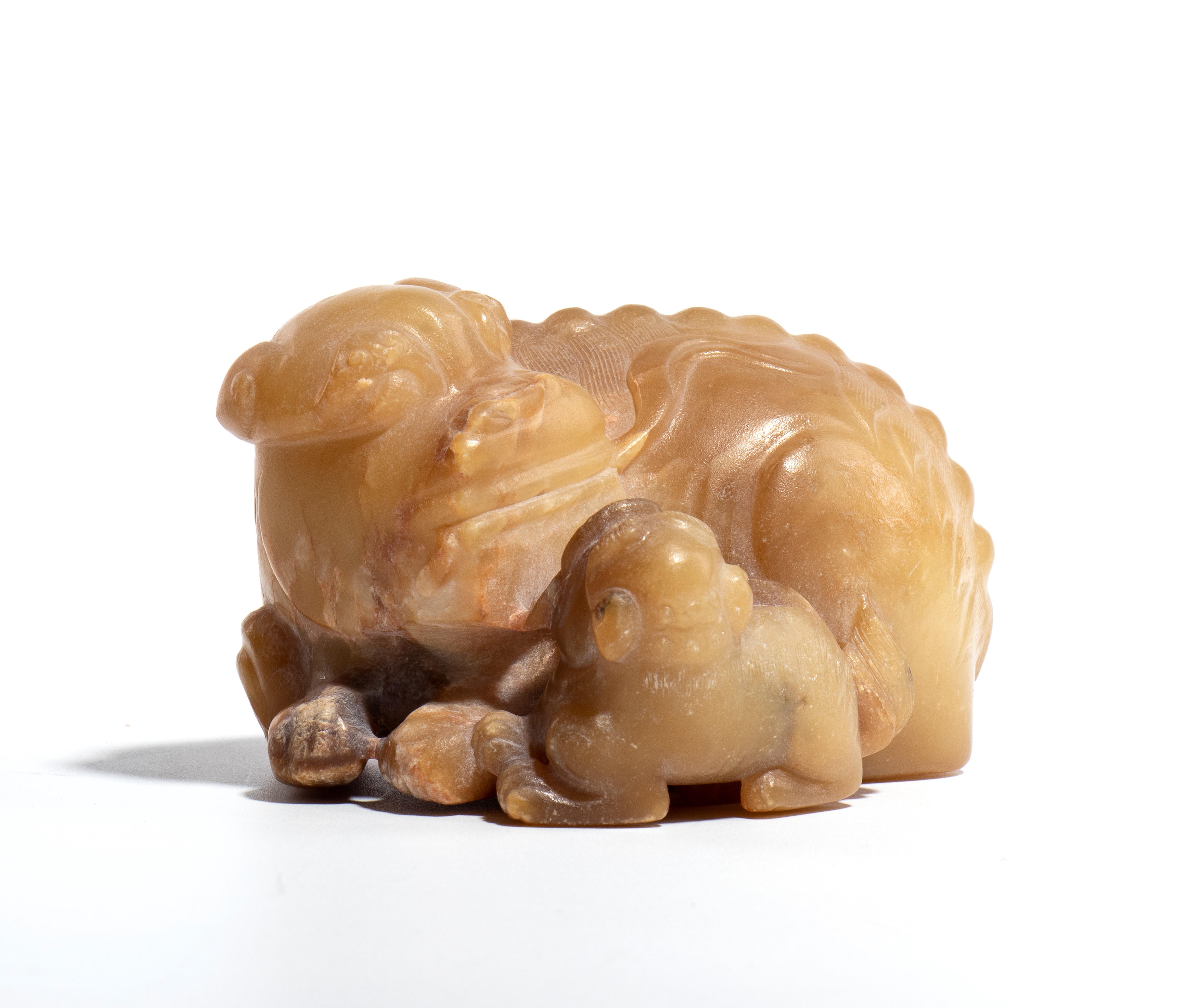 Intaglio in giada raffigurante un leone con il suo piccolo, simbolo di buon augurio.