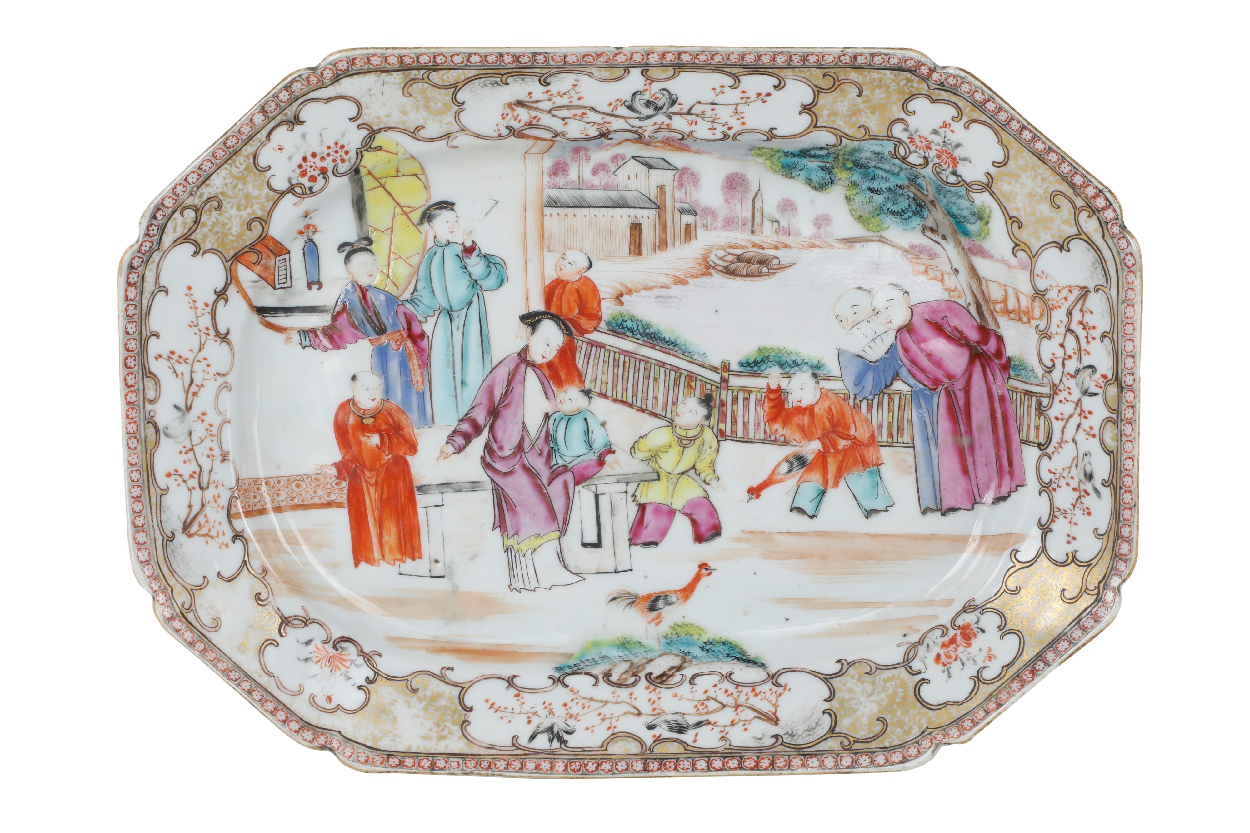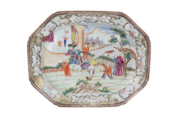 Lotto di 3 piatti di varie misure in porcellana di epoca Qian Long (1711-1799), smalto famiglia rosa con scene di vita di corte - esportazione.