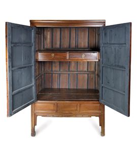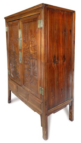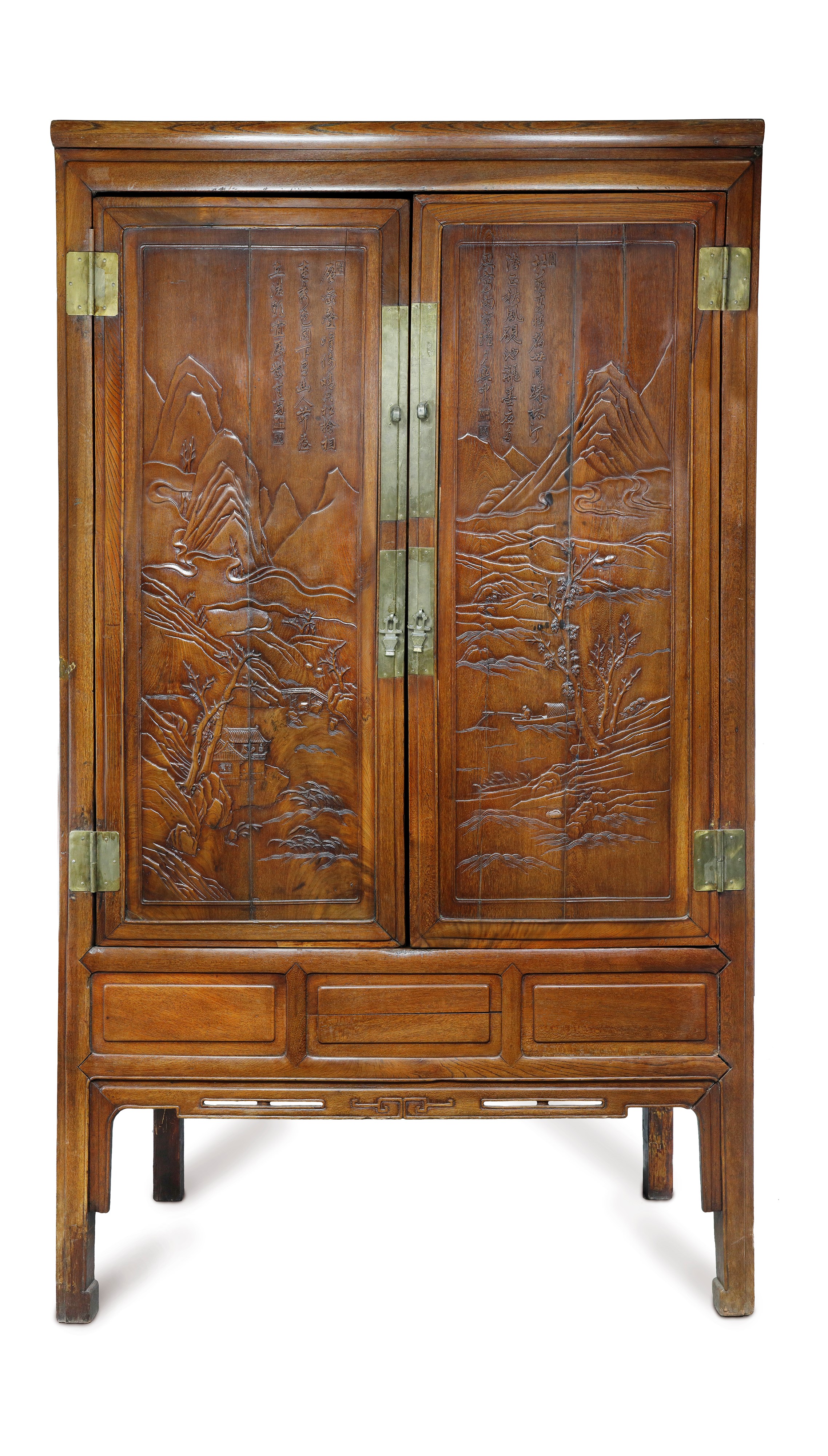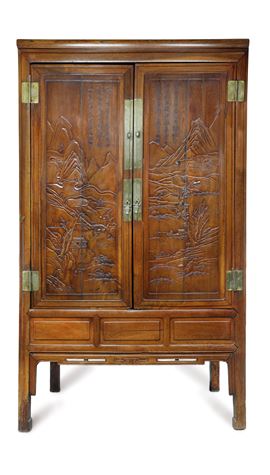 Mobile a doppio corpo, pannelli intagliati con scene naturaliste di montagna e descrizione calligrafica e sigilli.
