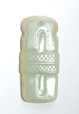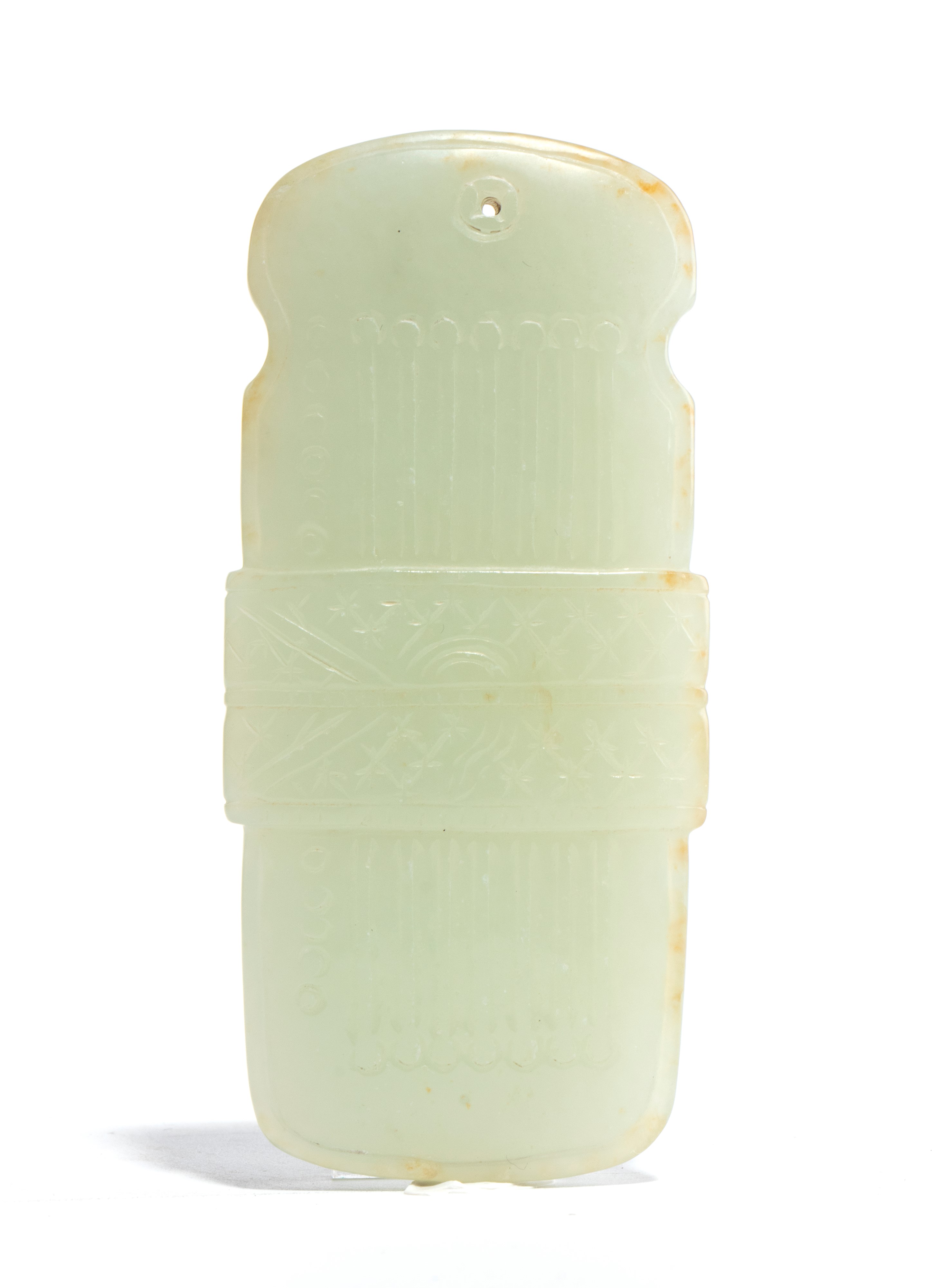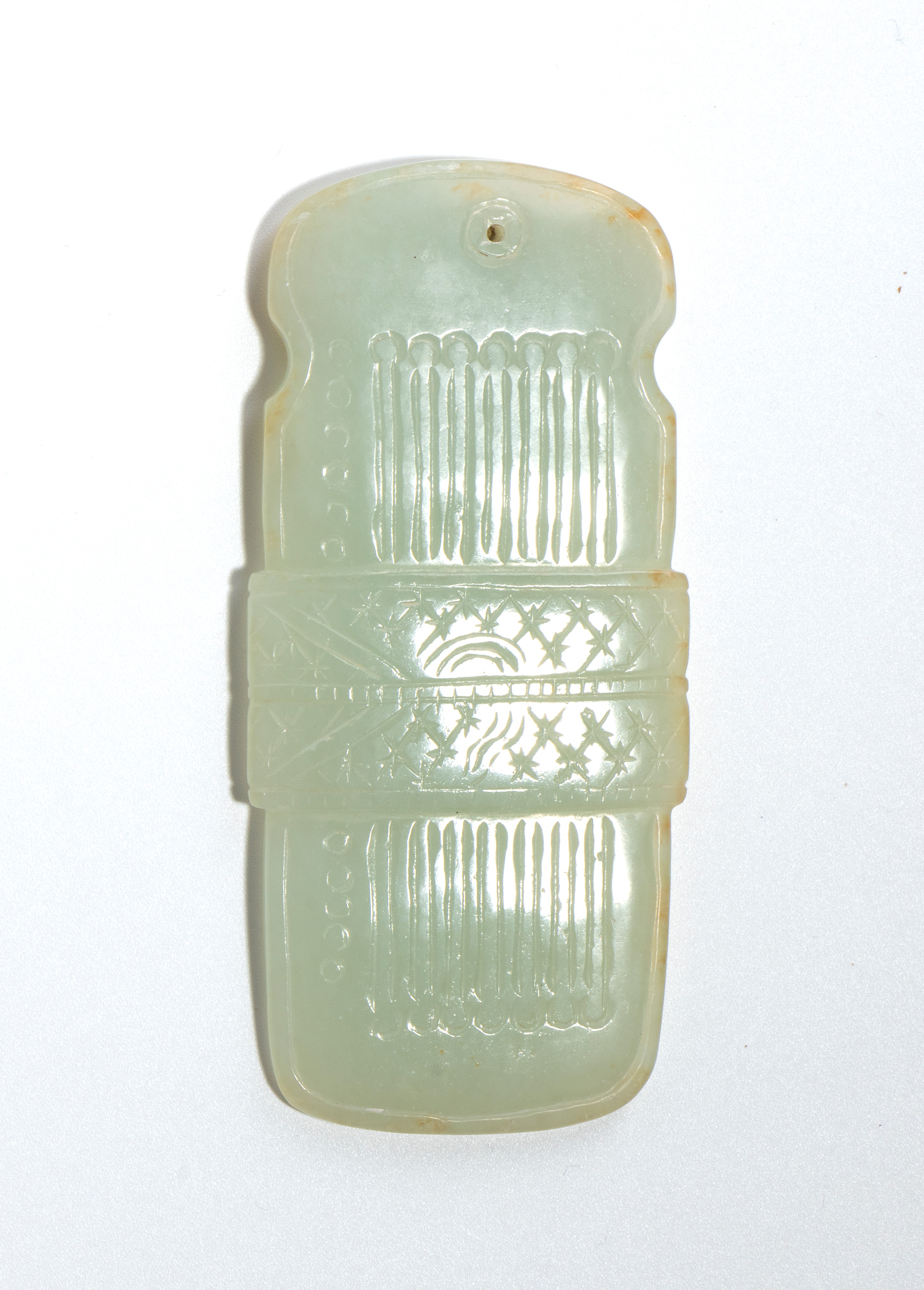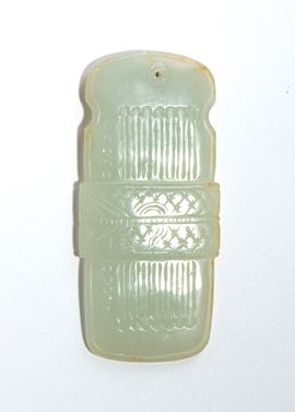 Ornamento pendente in giada bianca decorato di raffinati motivi geometrici incisi, provvista di foro di sospensione.