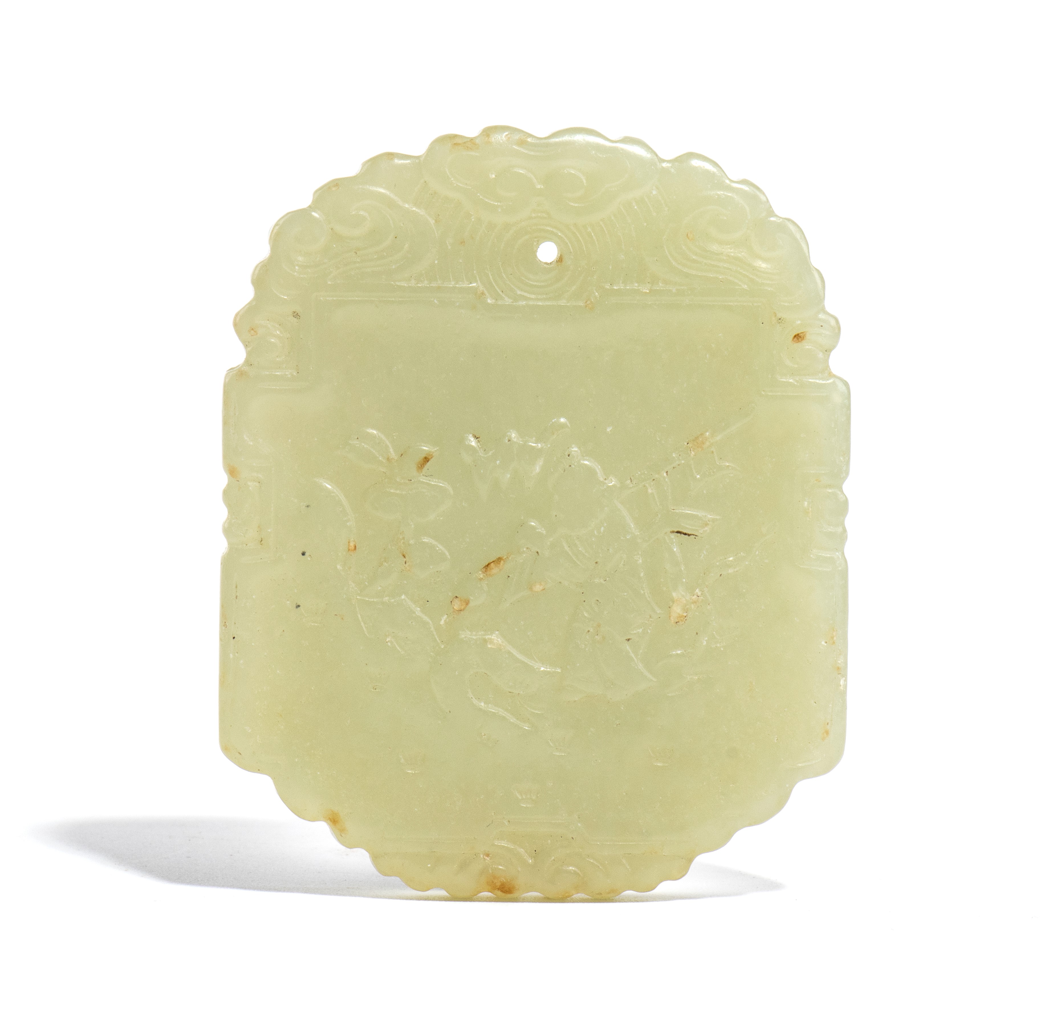 Ornamento pendente in giada a rilievo con un uomo al lavoro nei campi e caratteri cinese sul retro, provvista di foro di sospensione.