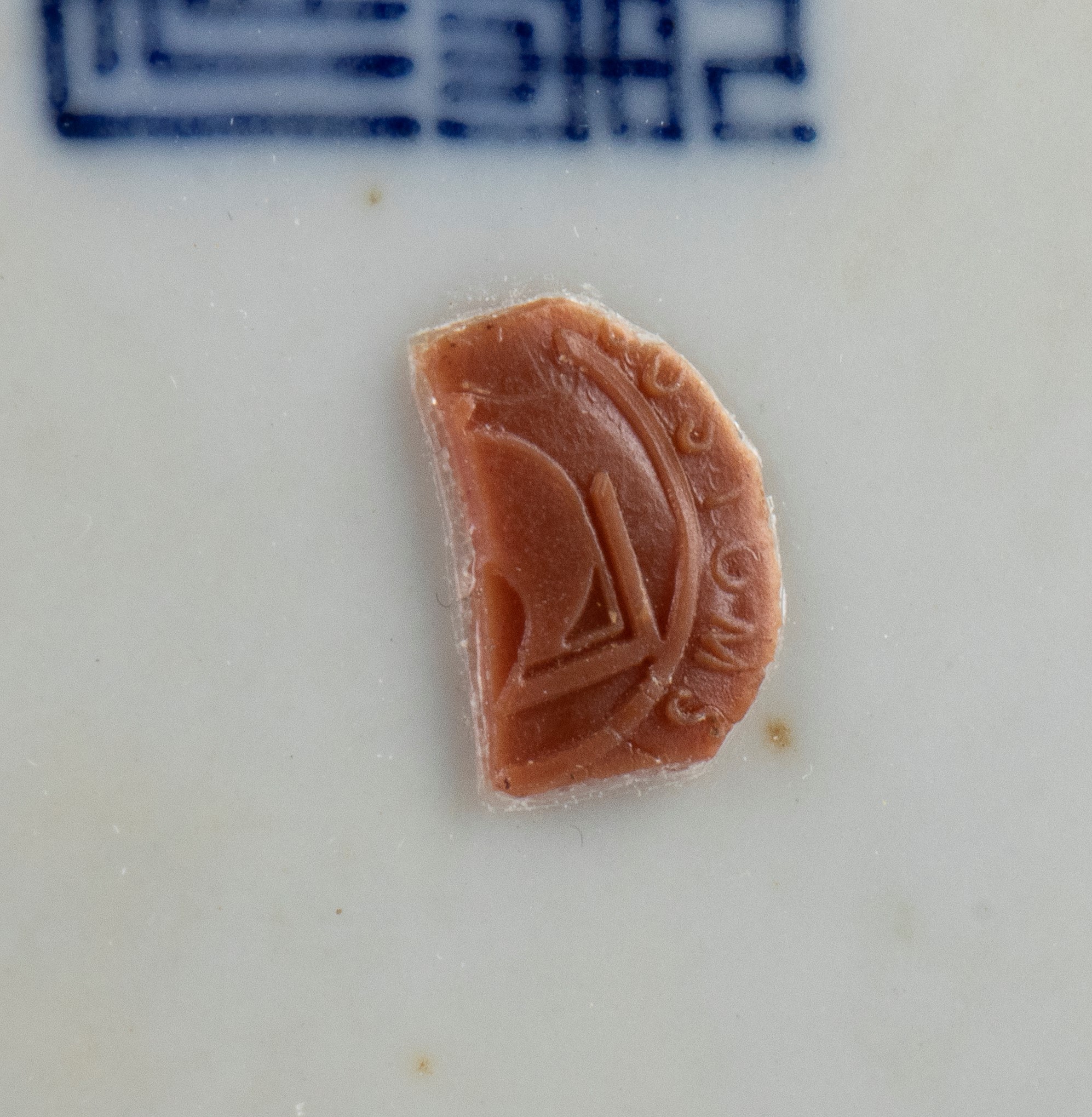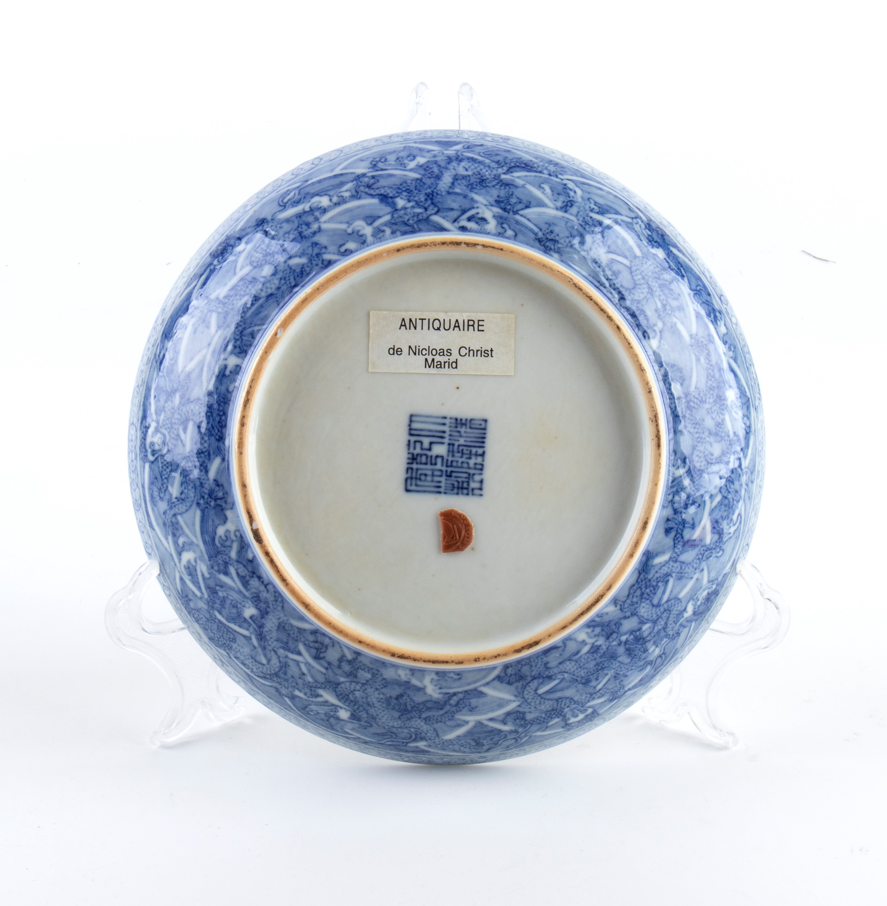 Piatto in porcellana bianca e blu con drago entro riserva con il marchio Qianlong sul fondo.