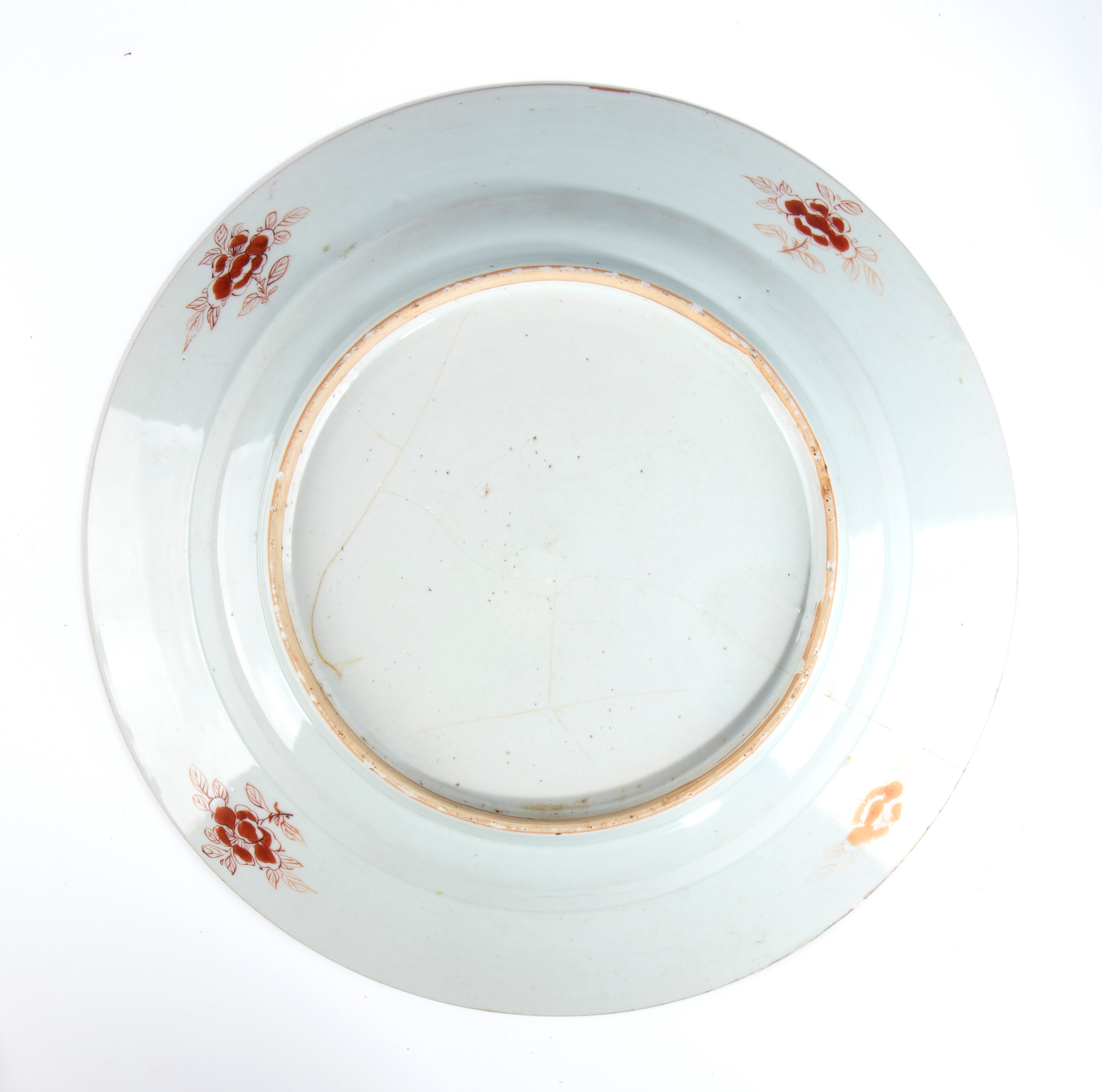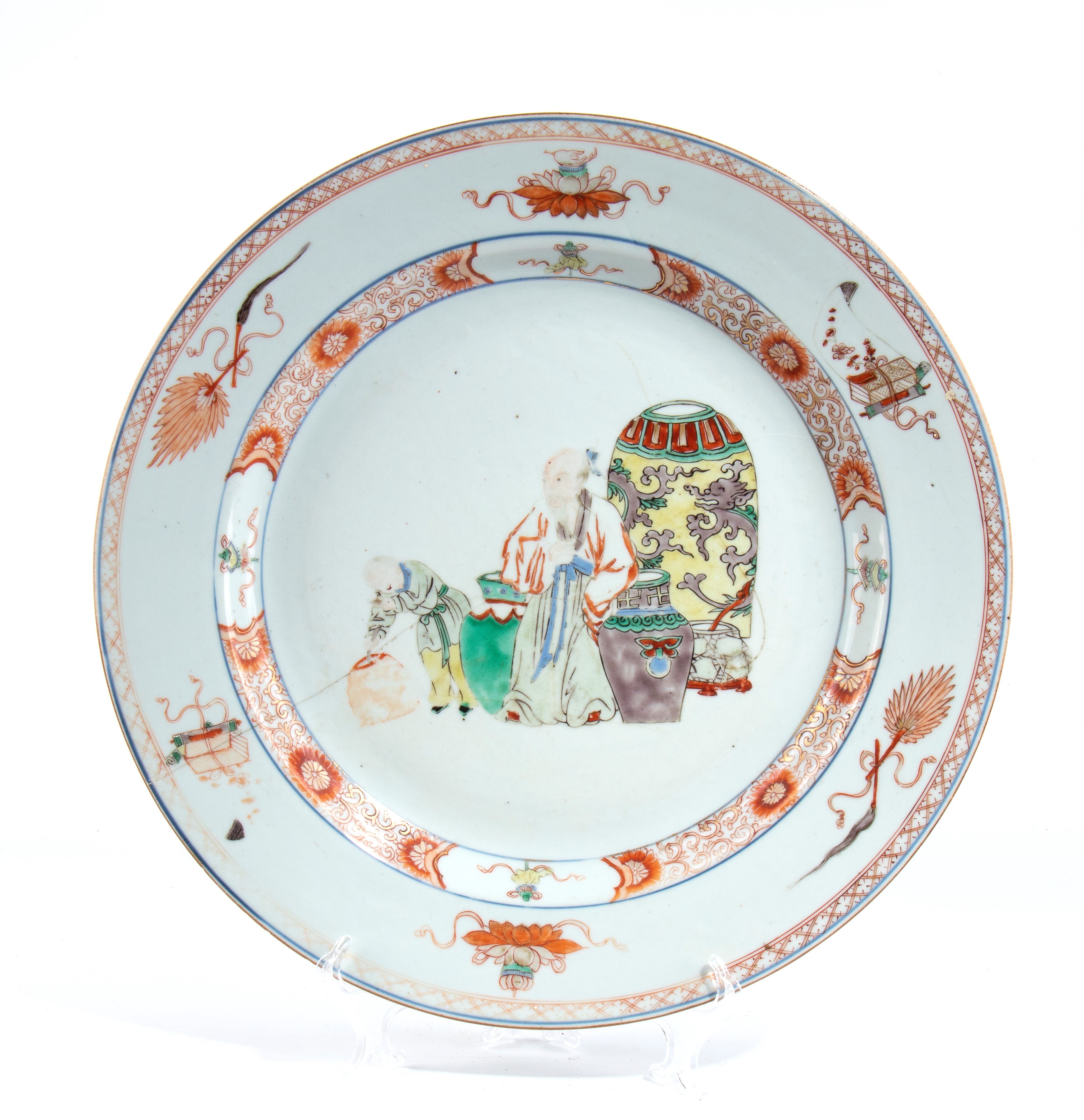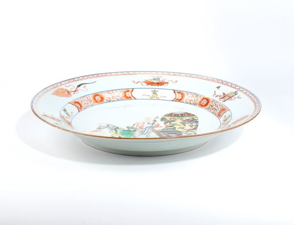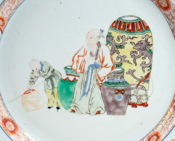 Piatto in porcellana famiglia verde, con filatura sulla parte inferiore del decoro centrale.