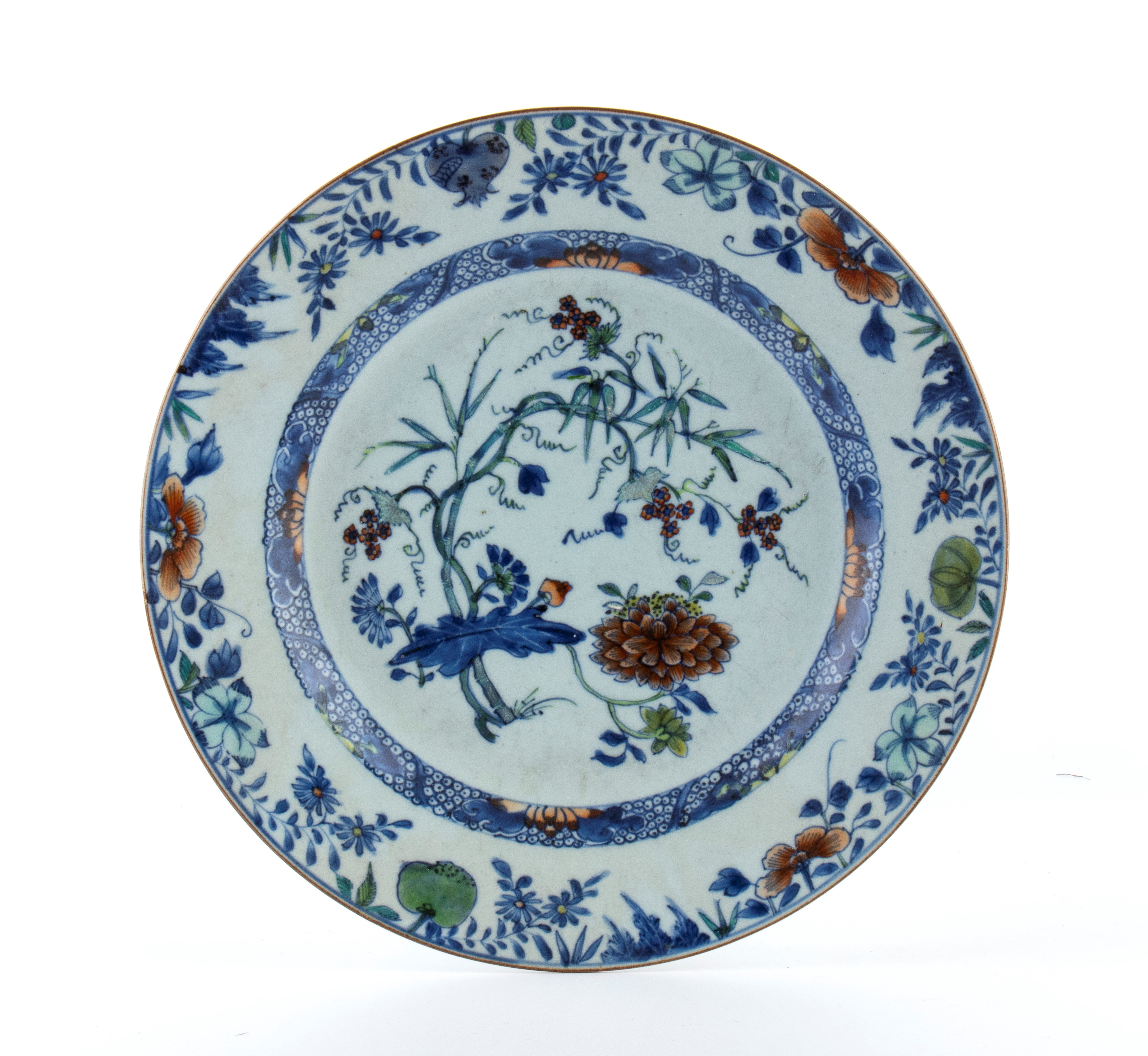 Piatto in porcellana policroma con decoro di bambù, fiori e grenada.